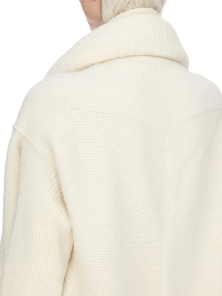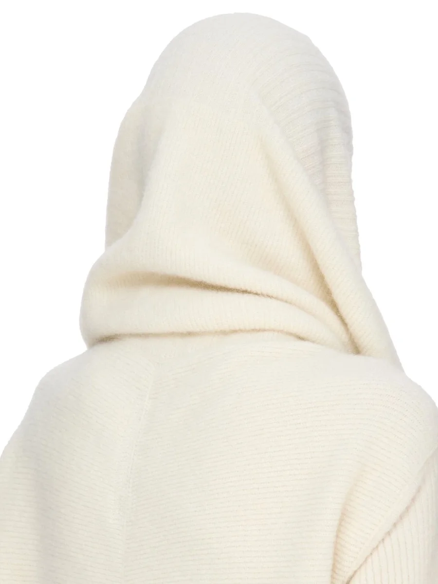 DEZE LANGE CARDIGAN IS ENKELHOOG, MET LANGE MOUWEN EN EEN RUIM PASVORM. DEZE HEEFT EEN OPEN VOORKANT MET EEN BREDE GERIBD SJAALKRAAG DIE ALS EEN CAPUCHON OVER HET HOOFD GEDRAGEN KAN WORDEN. DEZE HEEFT EEN BREDE GETRIBDE SCHOUDERLIJN EN ZIJZAKKEN AAN DE VOORKANT. DEZE HEEFT BREDE RIBBEN DIE VAN DE BOVENARM NAAR DE POLS LOPEN EN EEN KENMERKEND GEBREID KANAAL DAT LOOPT OVER HET MIDDEN VAN DE ACHTERKANT VAN DE RUGGENGRAAT.