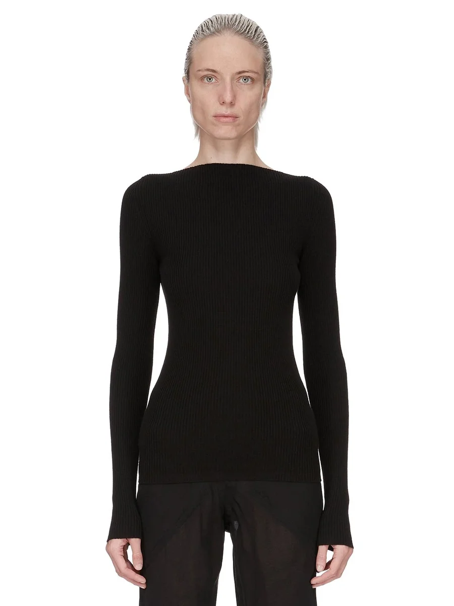 DEZE AL TOP IS HEUPLENGTE MET EEN NAUWSLUITENDE PASVORM EN LANGE MOUWEN. DEZE HEEFT EEN BREDE BOOTHALS EN EEN RONDE OPENING IN HET MIDDEN VAN DE RUG, MET HET KENMERKENDE GEBREIDE KANAAL DAT OVER DE ONDERSTE RUG LOOPT.