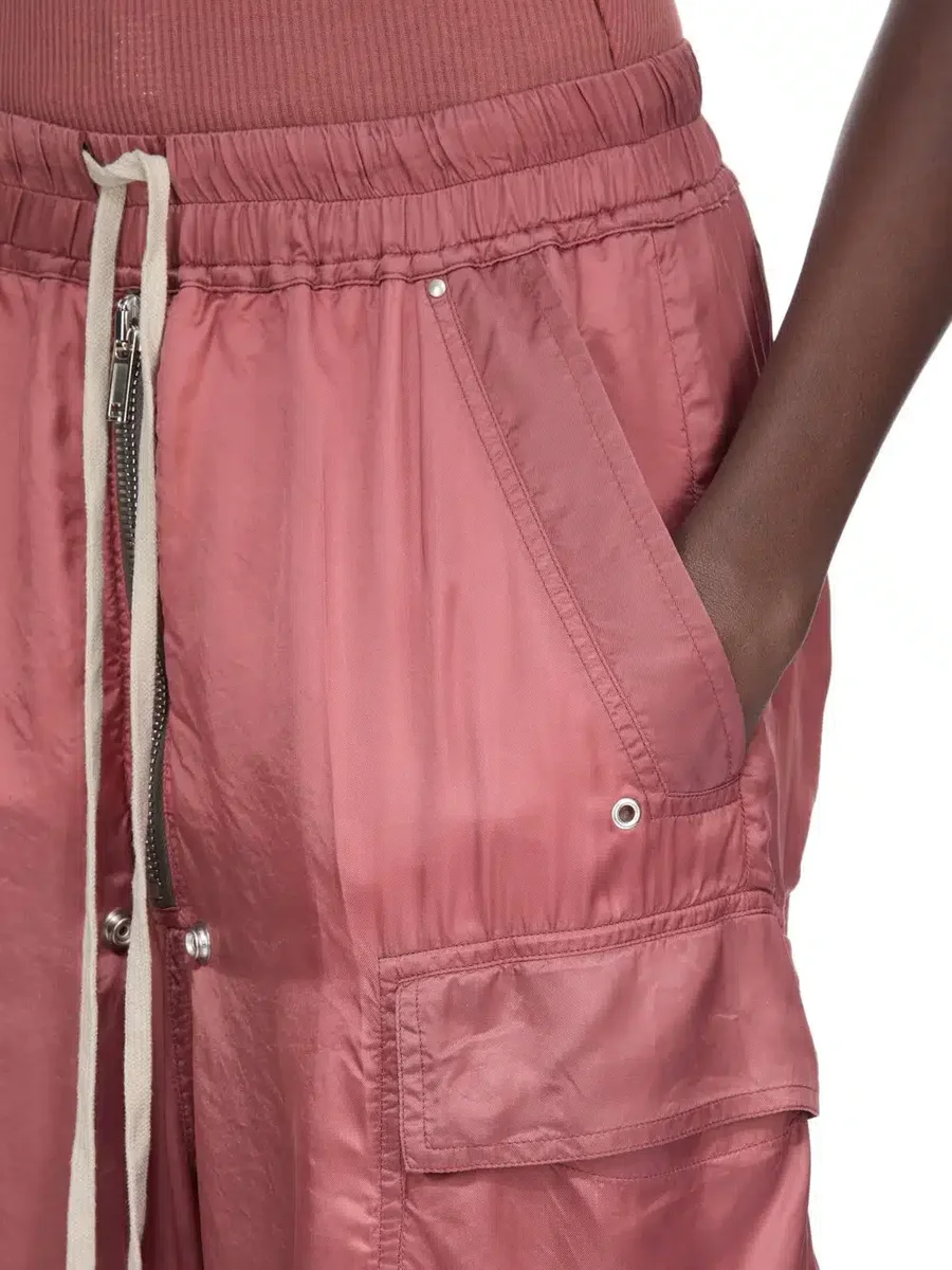 DEZE CARGOBELAS BROEK HEEFT EEN LANGE LENGTE, EEN LAAG KRUIS EN WIJDE PIJPEN. ZE HEBBEN EEN ELASTISCHE TAILLEBAND MET TREKKOORD EN EEN ZICHTBARE RITSSLUITING IN HET MIDDEN MET TWEE DRUKKEN AAN DE ONDERKANT. ZE HEBBEN ZIJZAKKEN MET KNOPEN EN OOGGEDETAILS, VIER AFGESCHUINDE CARGOZAKKEN AAN DE ZIJKANT VAN DE BEENLENGTE EN TWEE ACHTERZAKKEN MET VERBORGEN DRUKKEN EN DOORSTIKKEN.
