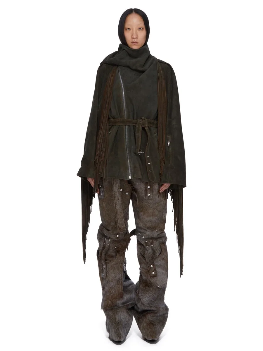 DEZE SJAAL FLIGHT IS LANG TOT ONDER DE HEUP EN HEEFT LANGE, BREDE MOUWEN. DEZE HEEFT EEN EXCENTREERDE RITSSLUITING DIE AAN DE ZIJKANT VAN DE NEK SLUIT EN WORDT BEDEKT DOOR EEN AANGEPAST SJAALSEGMENT DAT OVER DE RECHTERSCHOUDER WORDT GEDRAGEN. DEZE HEEFT EEN CEINTUUR OP TAILLEHOOGTE DIE MET EEN GESP WORDT SLUIT. DEZE HEEFT EEN SCHOUDERNAADVOUW, EEN VERBORGEN RITSZAK OP DE LINKERONDERARM EN ZIJZAKKEN. DEZE IS VOLLEDIG GEVOERD MET INTERNE RITSZAKKEN. DEZE VERSIE HEEFT EEN GERAFELDE RUG EN MOUWEN.