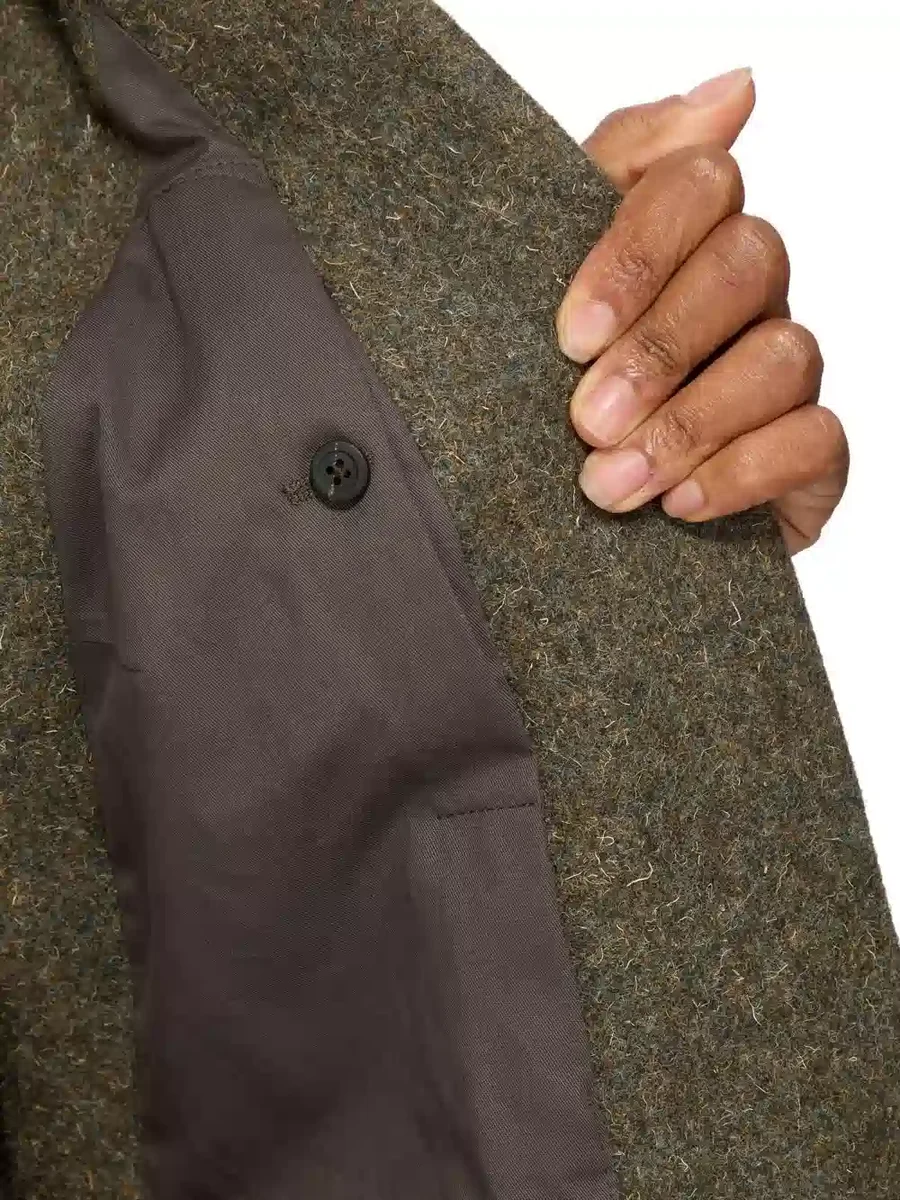 HIJ IS GEMAAKT VAN BRITSE WOL GEMENGD MET KEMP, OOK BEKEND ALS DOOD HAAR. KEMP-VEZELS ZIJN NATUURLIJK VOOR SOMMIGE SCHAPENRASSEN EN KUNNEN NIET VERVEN.