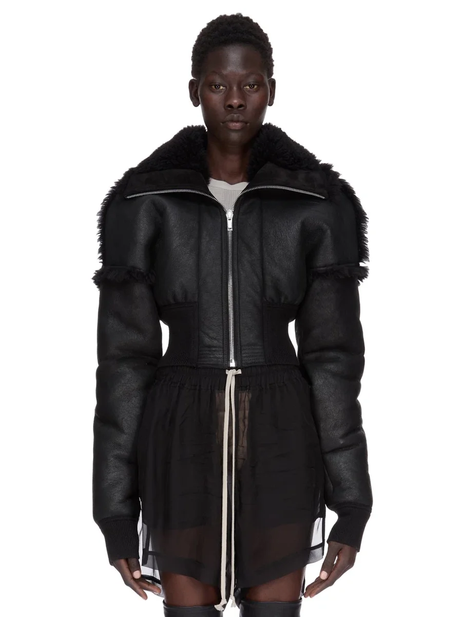 RICK OWENS FW25 CONCORDIANS FLIGHT JKT CROPPED IN ZWART GEKRULDE SHEARLING