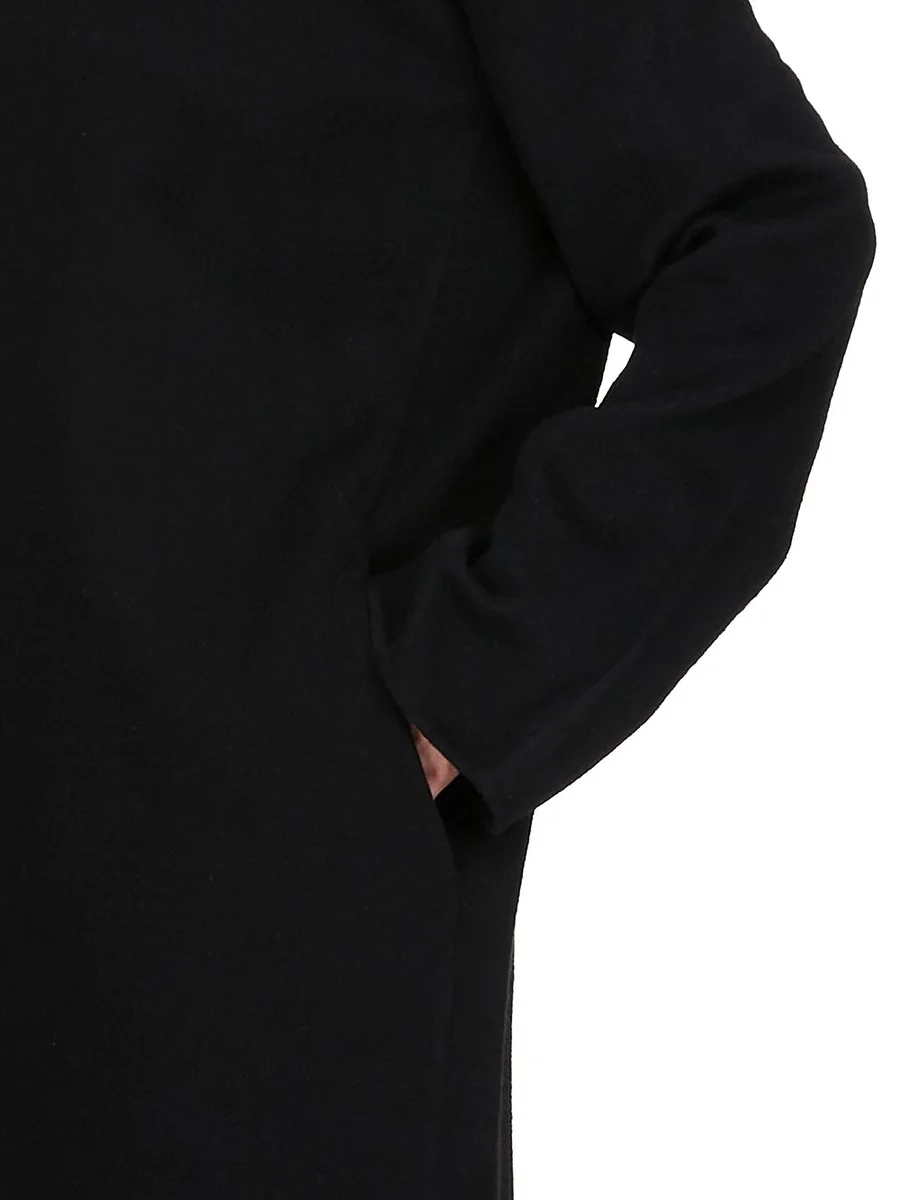 DEZE ISLAND JAS IS KALFLANG MET LANGE MOUWEN. HIJ HEEFT EEN SJAALKRAAG MET EEN VIERKANTE HALS EN RECHTE SCHOUDERNADEN. HIJ HEEFT EEN OVERSLAG MET VERBORGEN DRUKKEN, ZAKKEN IN DE ZIJNADEN. HIJ LOOPT TAPS NAAR DE ZOOM EN HEEFT EEN DRIEHOEKIGE SPLIT OP DE ACHTERKANT.