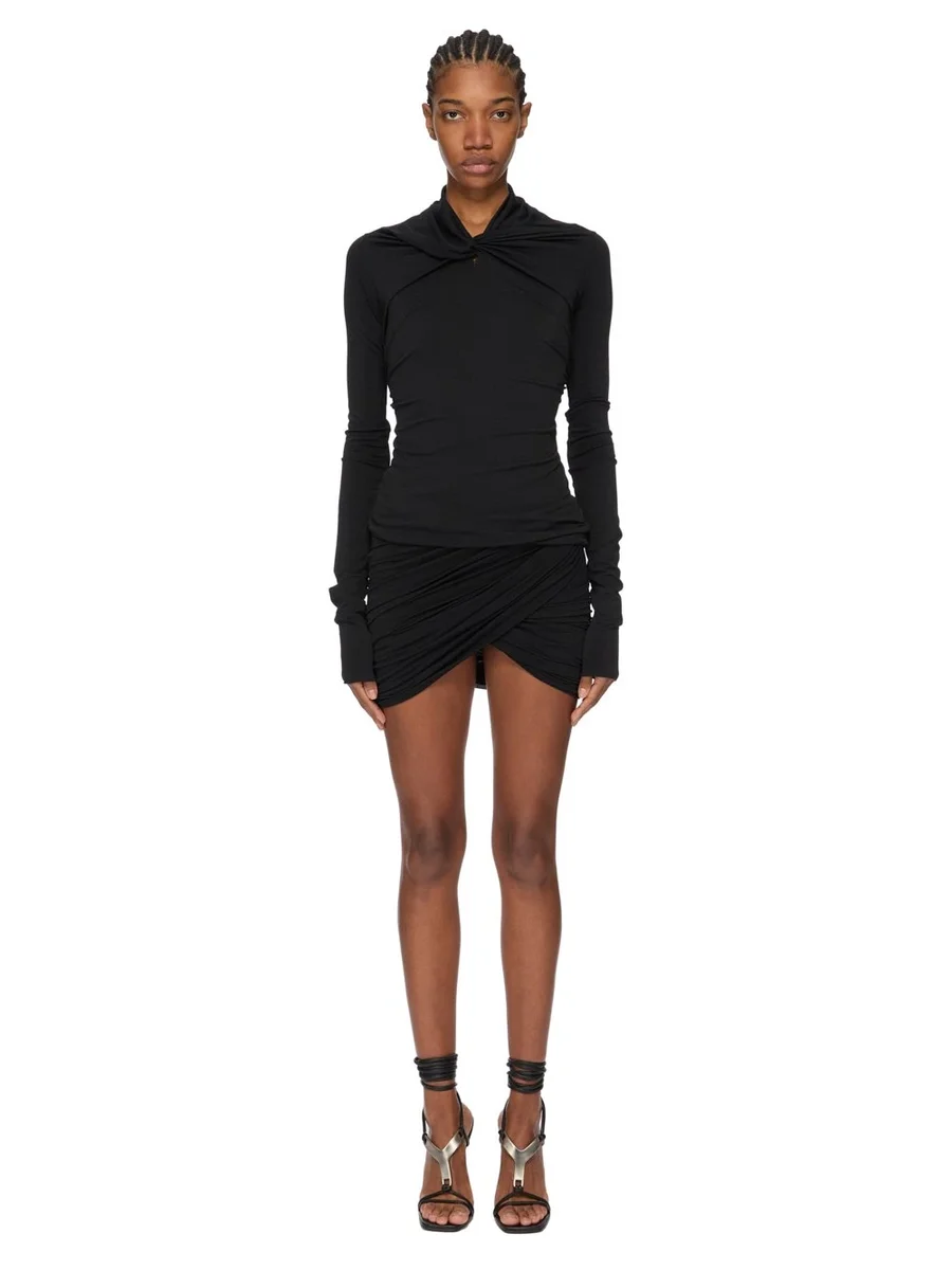 DEZE LUNA ROK IS HALFHOOG EN HEEFT EEN ELASTISCHE TAILLEBAND. DEZE HEEFT EEN NAUWSLUITENDE PASVORM EN LOOPT VAN RECHTS NAAR LINKS OVER HET LICHAAM LANGS EEN SCHUINE NAAD EN MEERDERE DRAPINGS.