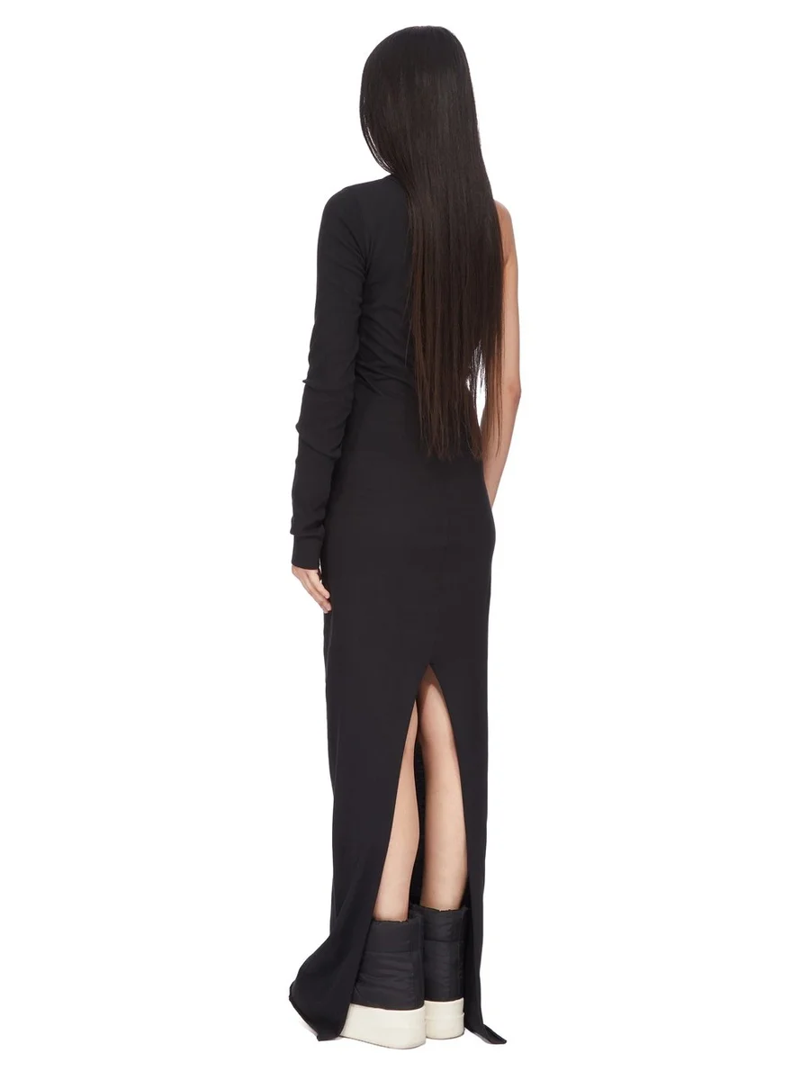 DEZE ZIGGY JURK IS LANGS DE VOORKANT EN HEEFT EEN KNIEHOGE RUGSPLIT. DE JURK HEEFT EEN ASYMMETRISCHE HALSLIJN MET ÉÉN SCHOUDER, ÉÉN LANGE MOUW EN DE KENMERKENDE ENKELE LIJN IN HET MIDDEN VAN DE RUG.