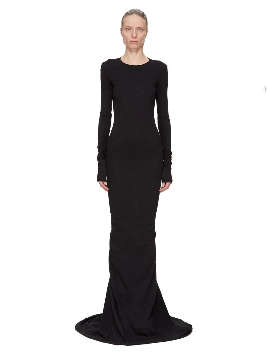 DEZE EENVOUDIGE EDFU-JURK VALT TOT OP DE TAND EN HEEFT EEN AANSLUITENDE PASVORM MET LANGE MOUWEN. DE JURK HEEFT EEN HOGE RONDE HALS EN EEN RECHTE SCHOUDERNAAD. DE JURK LOOPT UIT IN EEN VISSTAILSLEEP MET EEN GODET IN HET MIDDEN VAN DE RUG.