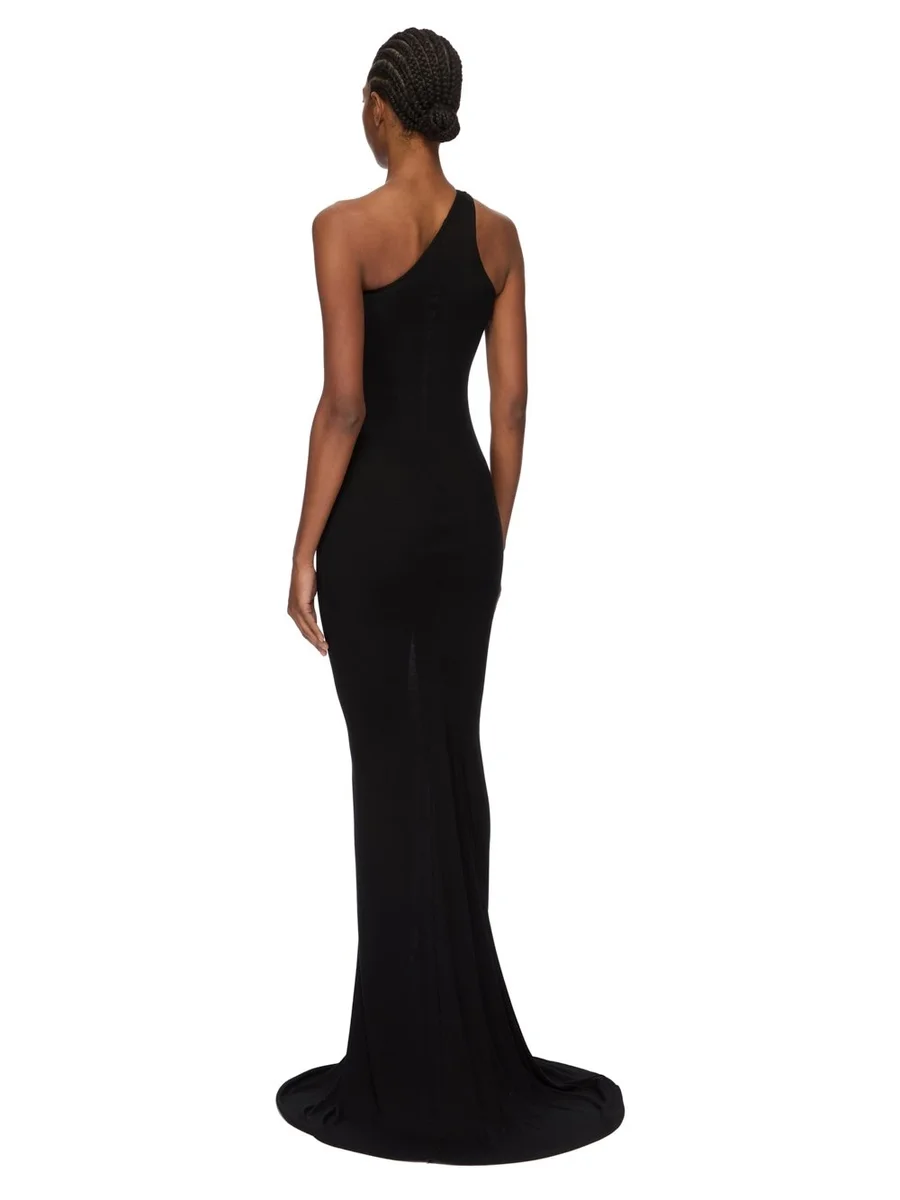RICK OWENS FW25 CONCORDIANS JURK MET ÉÉN SCHOUDER IN ZWARTE, VLOEIENDE VISCOSE JERSEY