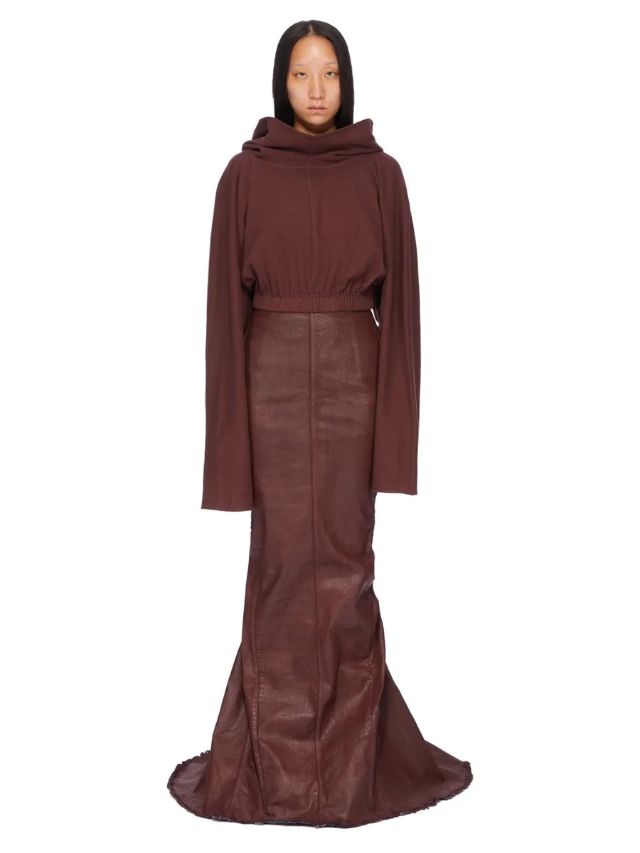 DEZE LIDO ROK KOMT TOT OP DE VLOER EN HEEFT EEN NAUWSLUITENDE PASVORM. DE ROK HEEFT EEN EXTRA HOGE TAILLE MET EEN TAILLEBAND, EEN RITSSLUITING AAN DE ACHTERKANT MET TREKLIPJE, ZIJZAKKEN EN EEN TAPSE ROK DIE VANAF DE KNIE UITLOOPT MET EEN GODET IN DE MIDDENNAAD OP DE ACHTERKANT.