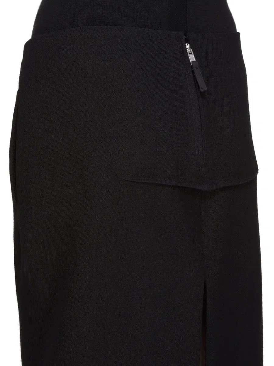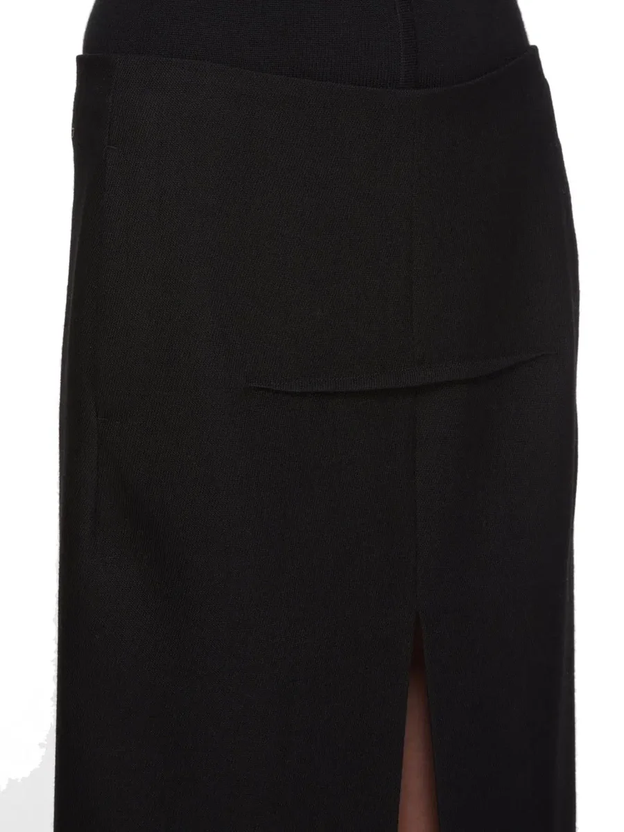 DEZE SLICED ROK IS LANGS DE ZIJKANTEN. HIJ HEEFT EEN RITSSLUITING IN HET MIDDEN VAN DE ACHTERKANT EN EEN NAUWSLUITENDE PASVORM. HIJ HEEFT TWEE HOGE SPLITTEN AAN DE VOOR- EN ACHTERKANT EN EEN RIBBENDE STIEK OP DE VOOR- EN ACHTERKANT. HIJ HEEFT ZAKKEN IN DE ZIJNADEN.