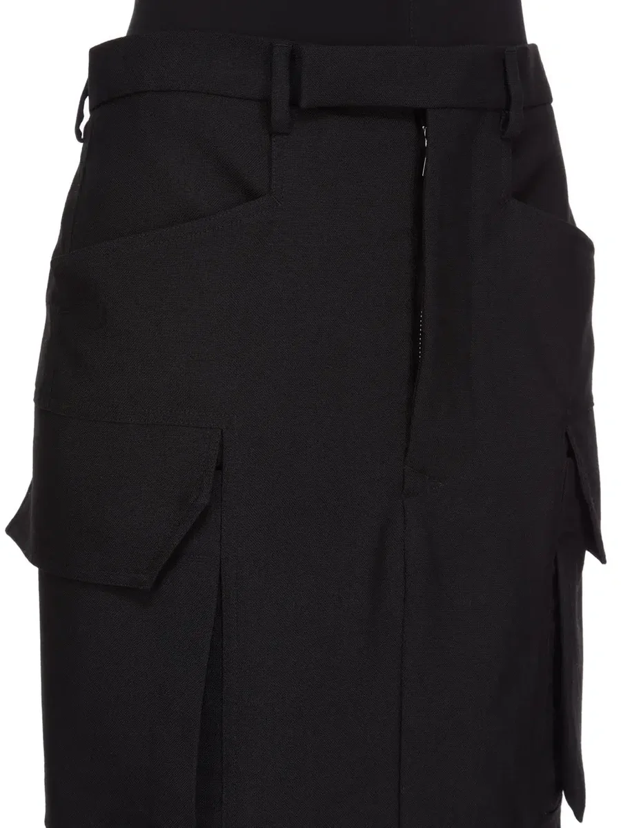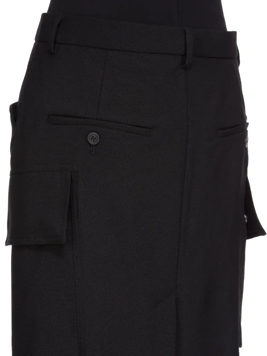 DEZE FIRBANKS ROK IS HALFHOOG EN HEEFT MASTODONZAKKEN OP DE BOVENKANT EN TWEE GROTE CARGOZAKKEN MET KLEPPEN OP HET ONDERSTE DIJBEEN. DE ROK HEEFT EEN TAILLEBAND MET VERBORGEN RITSSLUITING VOORAAN EN RIEMLUSSEN, ZIJZAKKEN EN ACHTERZAKKEN MET KNOPEN. DEZE VERSIE HEEFT EEN ONBEWERKTE ZOOM.