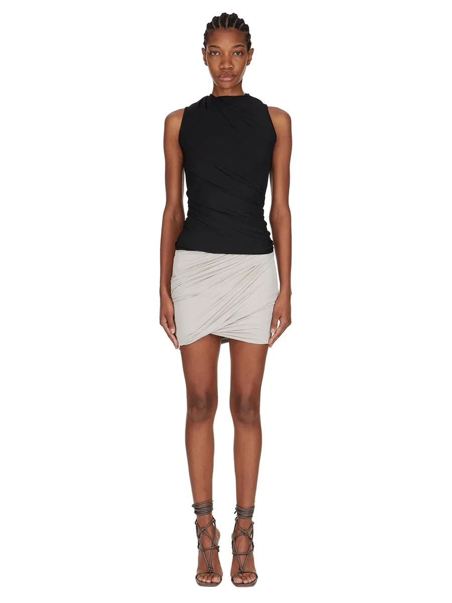 DEZE LUNA ROK IS HALFHOOG EN HEEFT EEN ELASTISCHE TAILLEBAND. DEZE ROK HEEFT EEN NAUWSLUITENDE PASVORM EN LOOPT VAN RECHTS NAAR LINKS OVER HET LICHAAM LANGS EEN SCHUINE NAAD EN MEERDERE DRAPINGS.