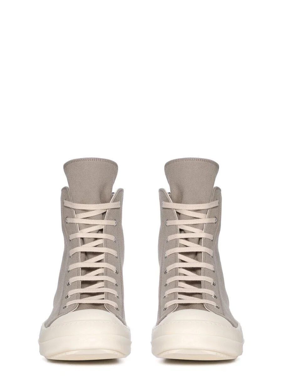 DEZE SNEAKS ZIJN HOOG EN HOOG EN HEBBEN ACHT OOGGETS, VETERS, EEN RITS AAN DE BINNENKANT VAN DE ENKEL VOOR EENVOUDIG SLUITEN, NEUSKAPPEN EN ZOLEN MET HAAIENTANDEN.