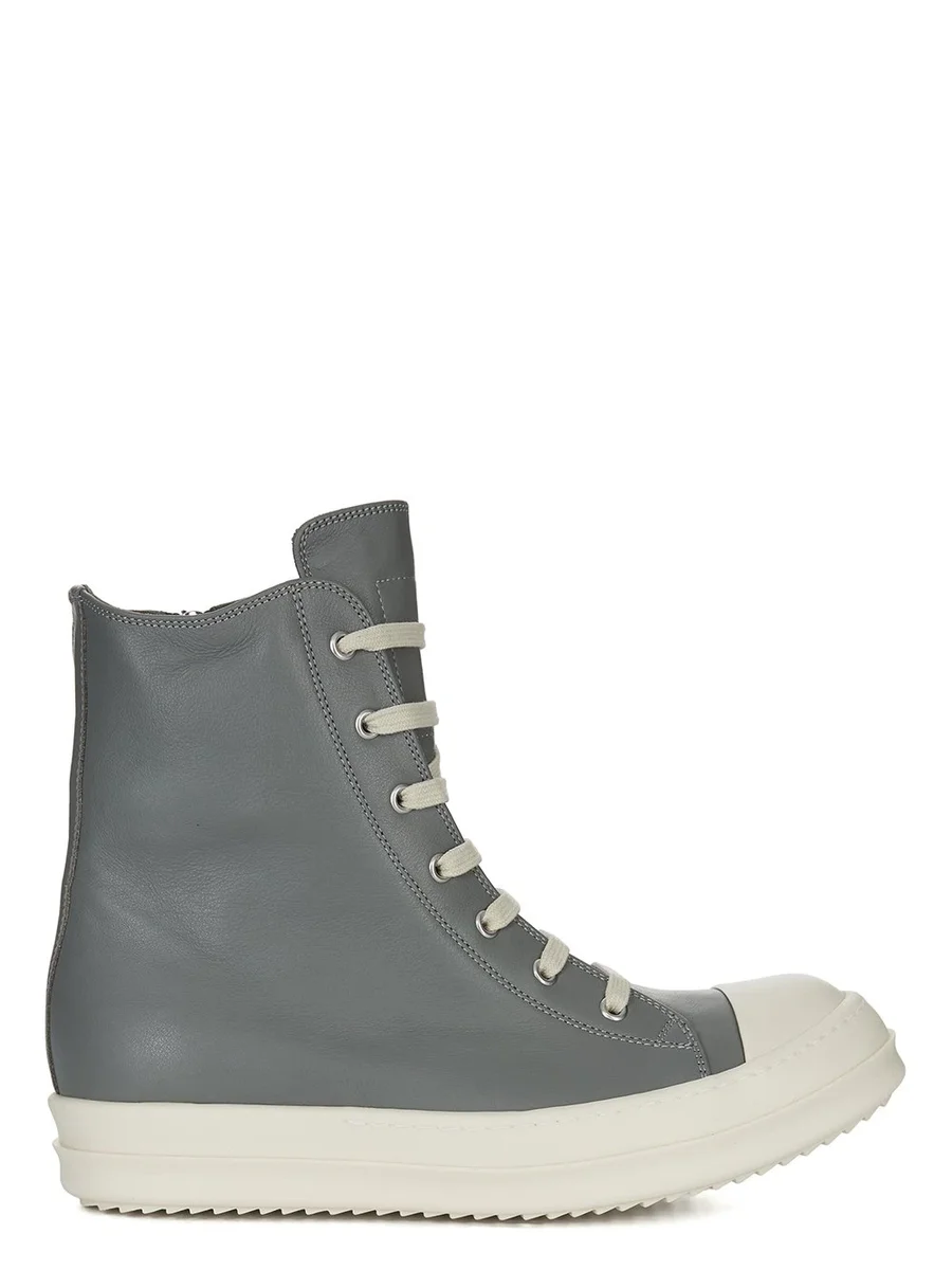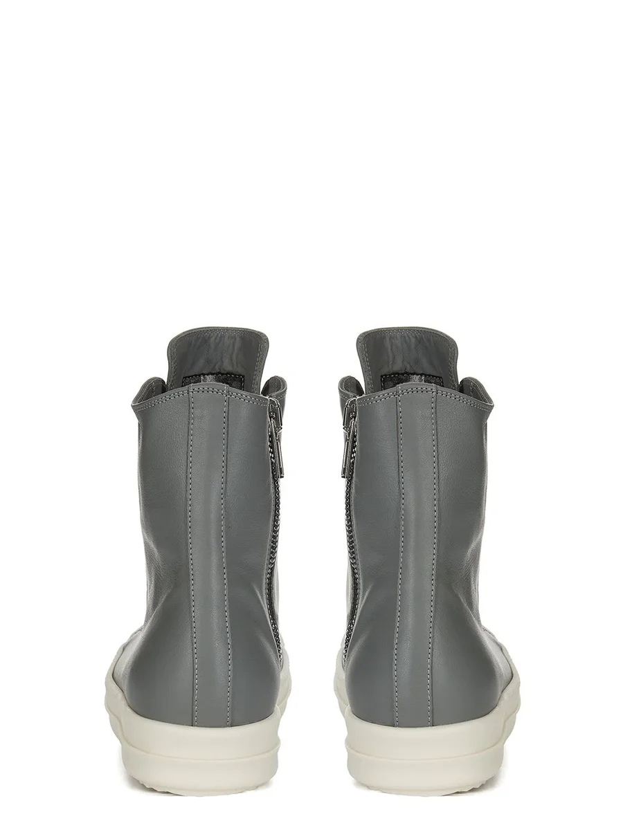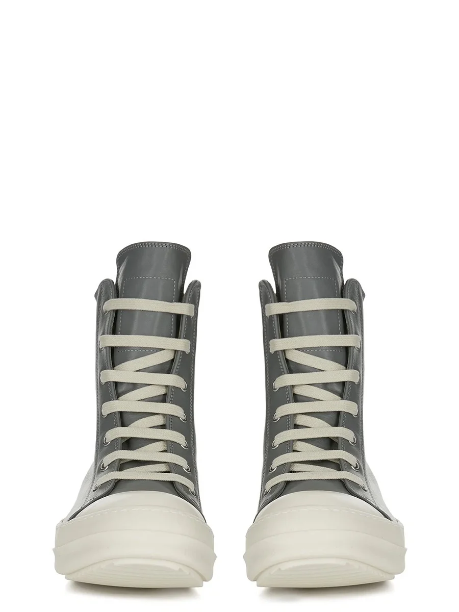 DEZE SNEAKERS ZIJN HOOG EN VOLLEDIG EN VOORZIEN VAN ZEVEN OOGGEVELTJES, VETERS, EEN RITS AAN DE BINNENKANT VAN DE ENKEL VOOR EENVOUDIG SLUITEN, NEUSKAPPEN EN HAAIENTANDEN BUMPERZOLEN.