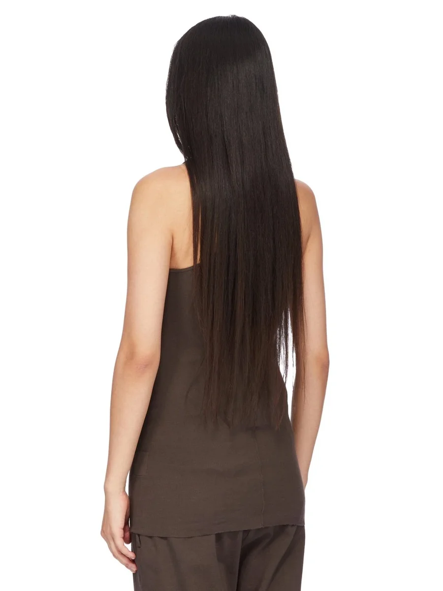 DEZE RACERBACK TANK IS HEUPLENGTE MET EEN RECHTE, RAW GESNEDEN ZOOM. HET HEEFT EEN RONDE HALS EN DUNNE SCHOUDERBANDJES DIE OVERLOPEN IN EEN RACERBACK. HET HEEFT DE KENMERKENDE ENKELE NAAD DIE OVER HET MIDDEN VAN DE ACHTERKANT LOOPT.