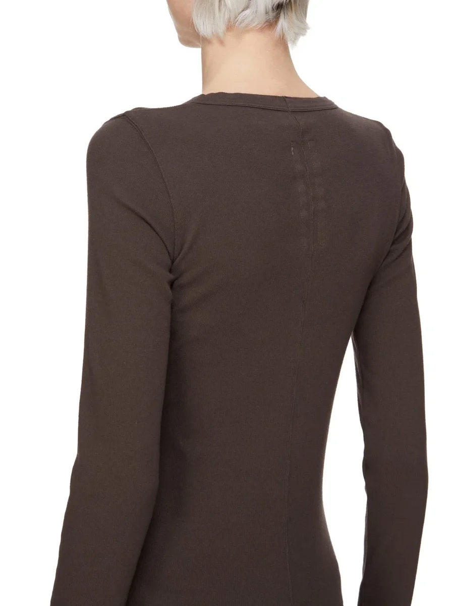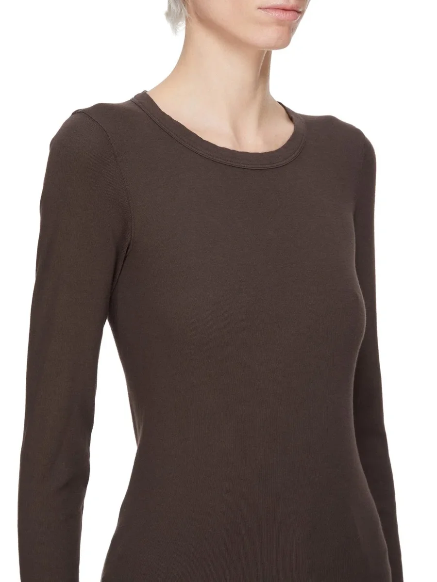 Dit geribbelde LS T-shirt valt onder de heupen, heeft een slanke pasvorm en lange mouwen. Het heeft een geribbelde ronde hals, een ruw gesneden zoom, manchetten en de kenmerkende enkele naad die over het midden van de rug loopt.