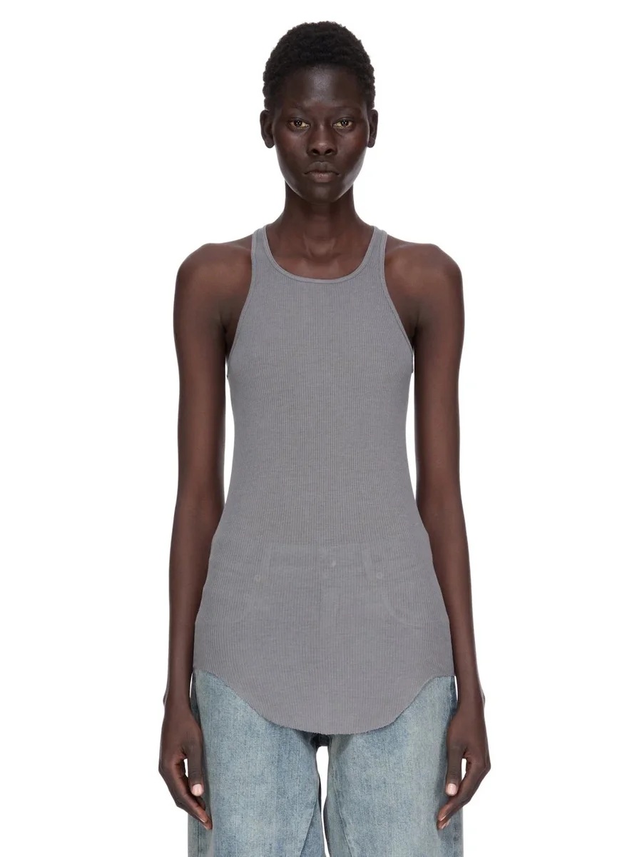 DEZE BASIC RIB TANKTOP HEUPLENGTE MET EEN AFGERONDE, RUW GESNEDEN ZOOM DIE AAN DE VOOR- EN ACHTERKANT DOORLOOPT. DEZE TANKTOP HEEFT EEN RONDE HALS EN DUNNE SCHOUDERBANDJES DIE UITLOPEN IN EEN LICHTE RACERBACK. HET HEEFT DE KENMERKENDE ENKELE NAAD DIE OVER HET MIDDEN VAN DE ACHTERKANT LOOPT.