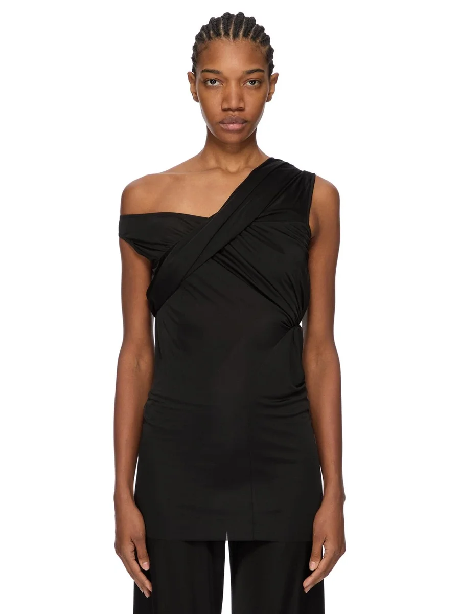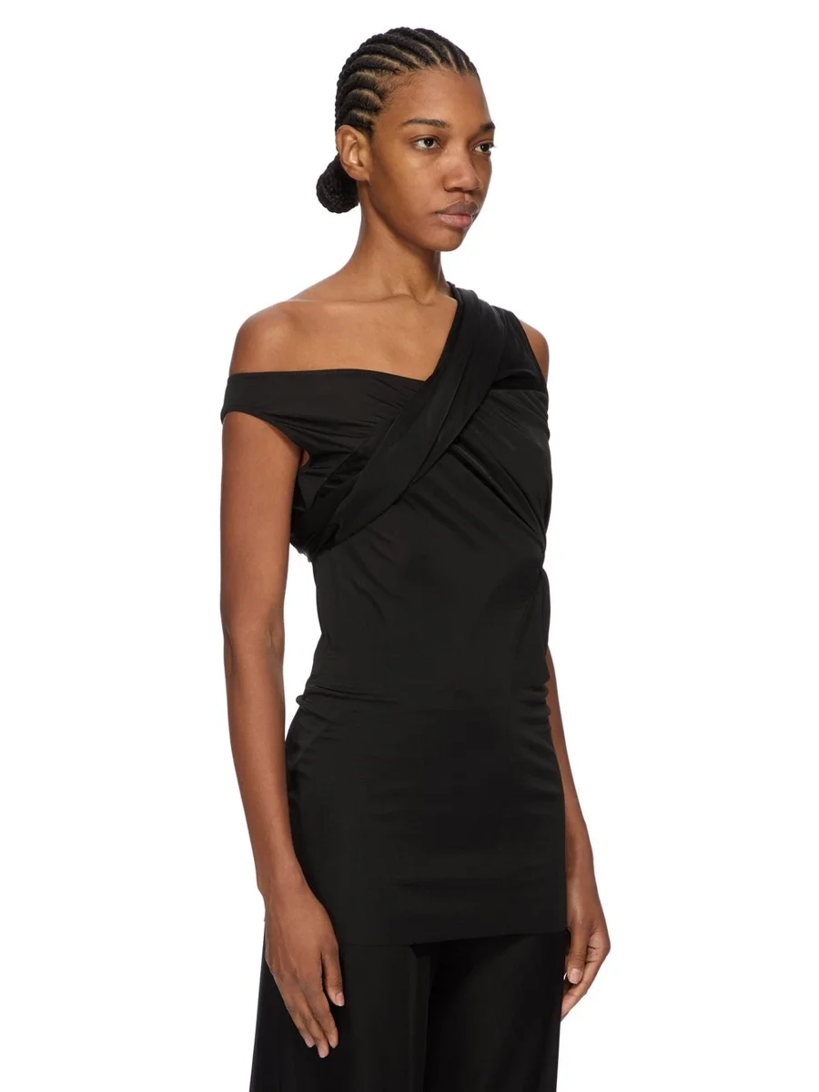 RICK OWENS FW25 CONCORDIANS SAHARA TOP IN ZWARTE SATIJNEN VISCOSE JERSEY