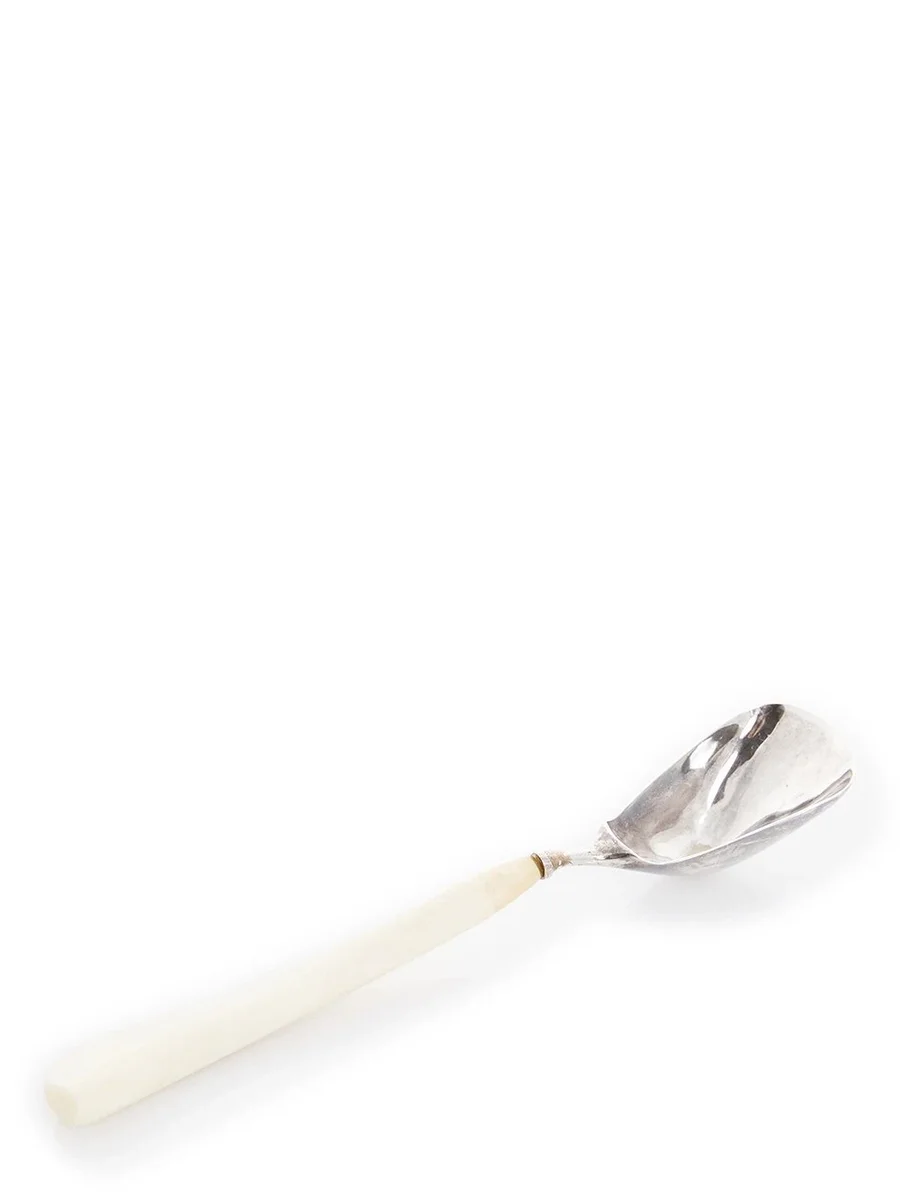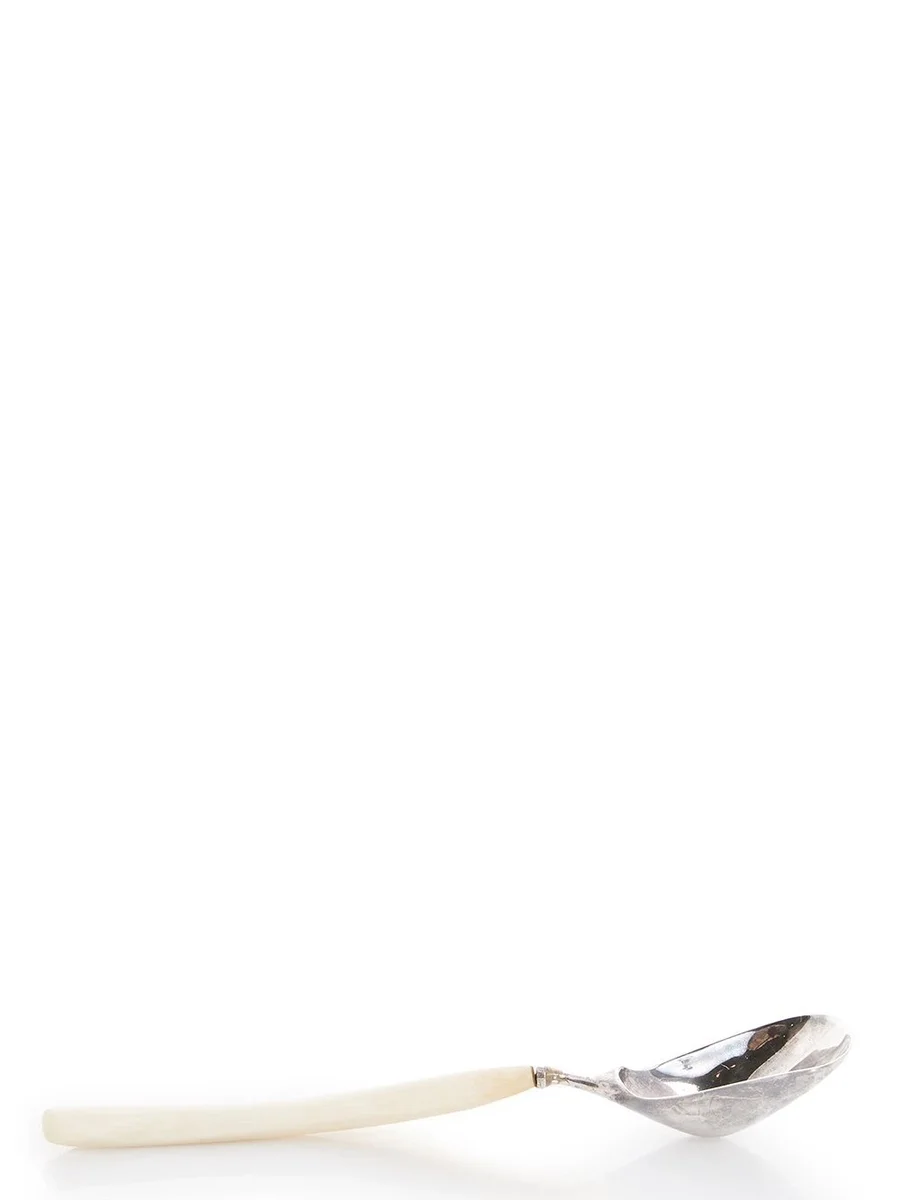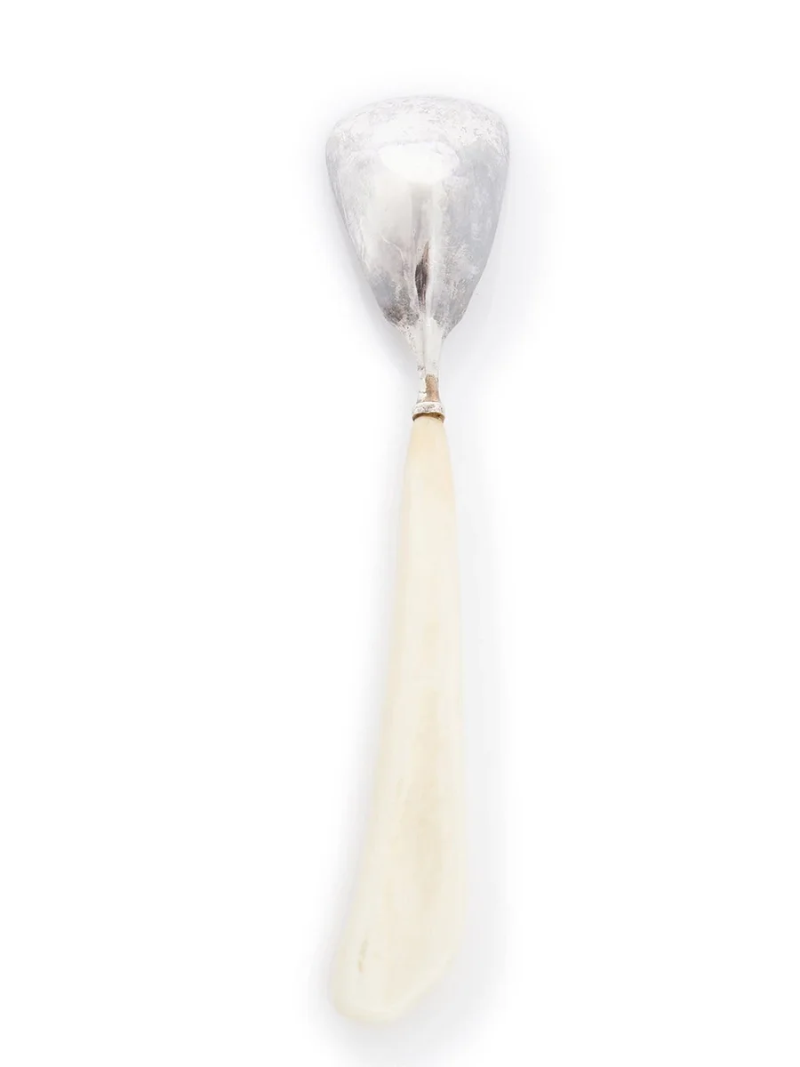 De RICK OWENS serveerlepel heeft een grote sterling zilveren bovenkant en een lange, natuurlijk gekleurde handgreep van bot.