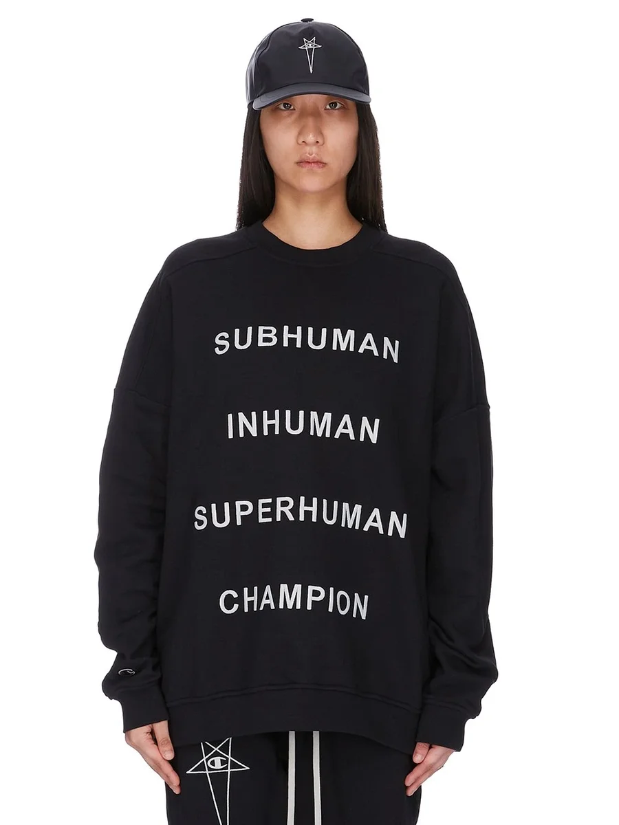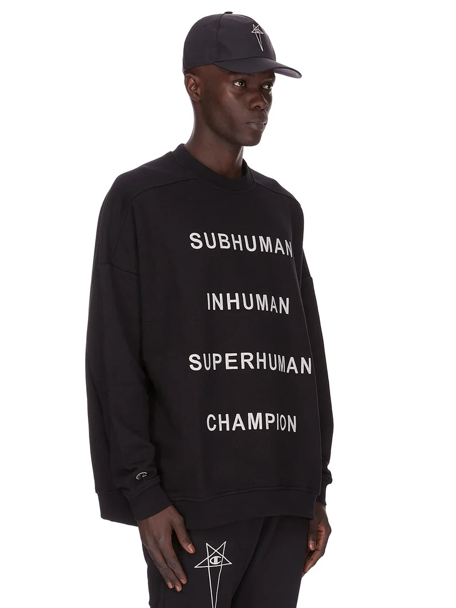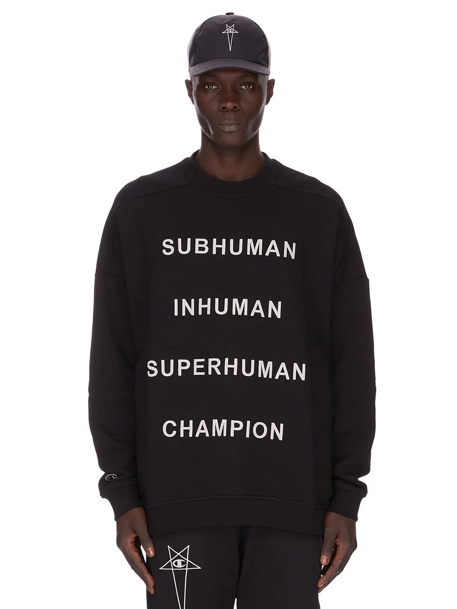 HET HEEFT EEN KLEINE 3D CHAMPION X RICK OWENS PENTAGRAM LOGO PATCH OP DE VOORKANT.