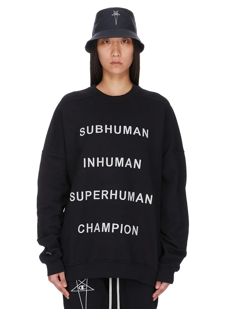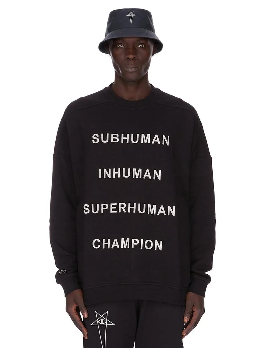 HET IS VOORZIEN VAN EEN KLEINE 3D CHAMPION X RICK OWENS PENTAGRAM-LOGOPATCH OP DE VOORKANT.