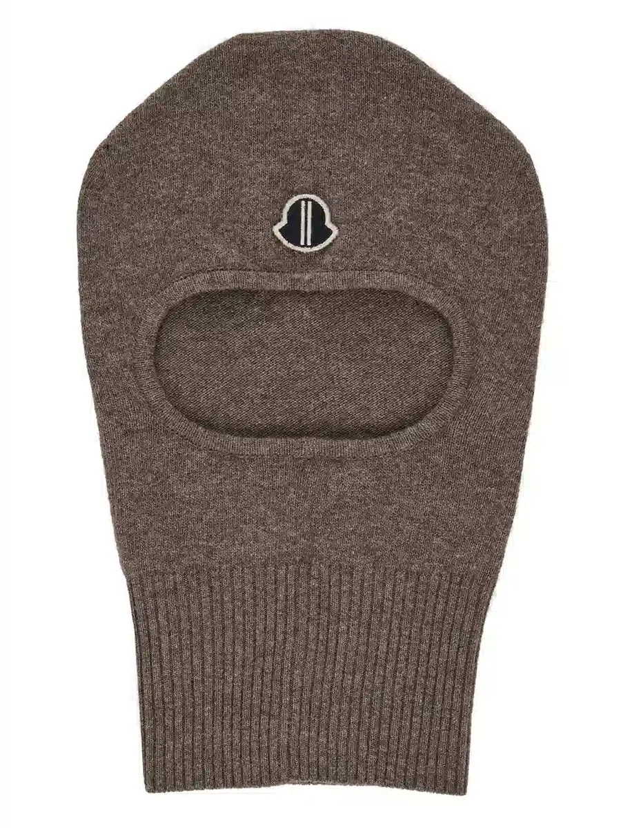 DEZE GEBREIDE SCHEDEL IS EEN BALACLAVA DIE HOOFD EN NEK BEDEKT MET EEN BREDE, AFGERONDE OPENING VOOR HET GEZICHT EN EEN BREDE, GERIBD NEK. HIJ HEEFT EEN GEBORDUURDE RICK OWENS + MONCLER PATCH OP HET VOORHOOFD.