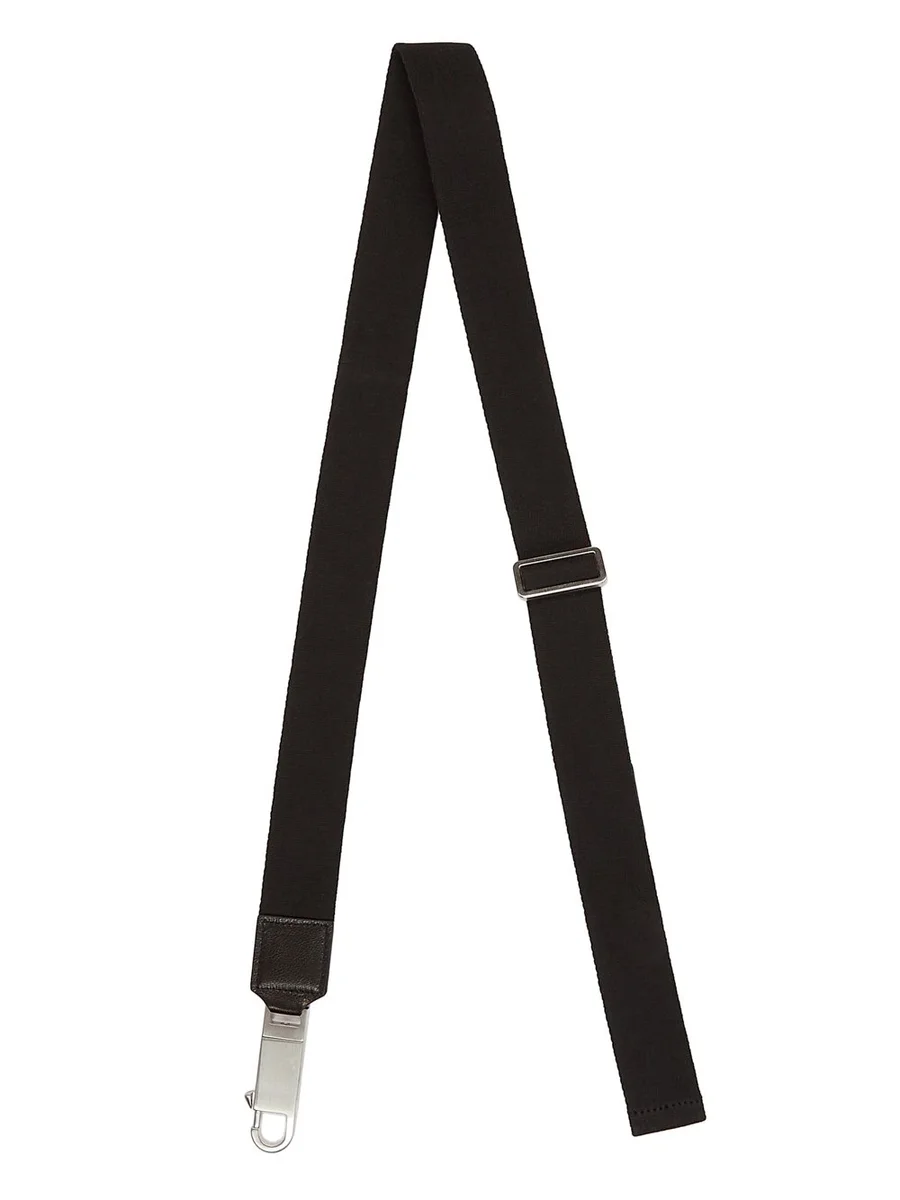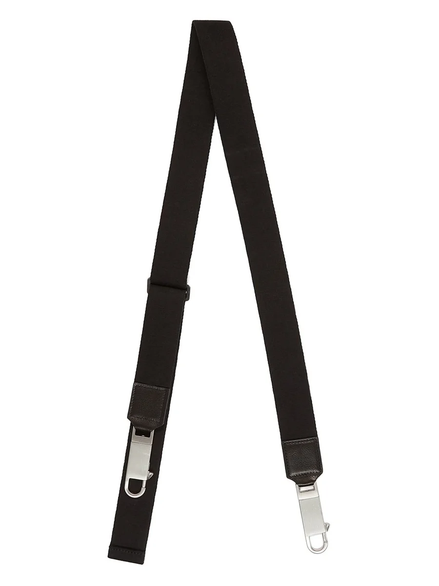 DEZE WEBBING BAND IS EEN VERSTELBARE TASSENBAND VAN DIKKE KATOENEN BAND. AAN BEIDE UITEINDEN IS EEN GROTE KARAKTERHAAK VAN PALLADIUMMESSING. DEZE BAND IS ONTWORPEN OM TE WORDEN VERKOCHT ALS AANVULLING OP AL ONZE TASSEN MET AFNEEMBARE LEDEREN BAND. HET IS BEDRUKT MET HET RICK OWENS LOGO.