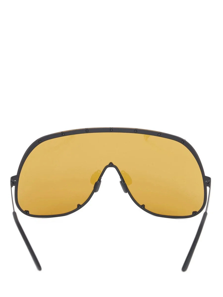 DEZE SHIELD ZONNEBRIL HEEFT EEN MONTUUR VAN CHIRURGISCH ROESTVRIJ STAAL, EEN ENKELE VOLUMINEUS GEBOGEN LENS DIE MET SCHROEVEN WORDT BEVESTIGT EN EEN RUBBEREN NEUSKUSJE. ZE HEBBEN SLANKE METALEN POTEN MET HET RICK OWENS LOGO AAN DE BINNENKANT VAN DE RECHTERPOTEN. NIET GESCHIKT VOOR CONVERSIE NAAR BRILLEN OP STERKTE.