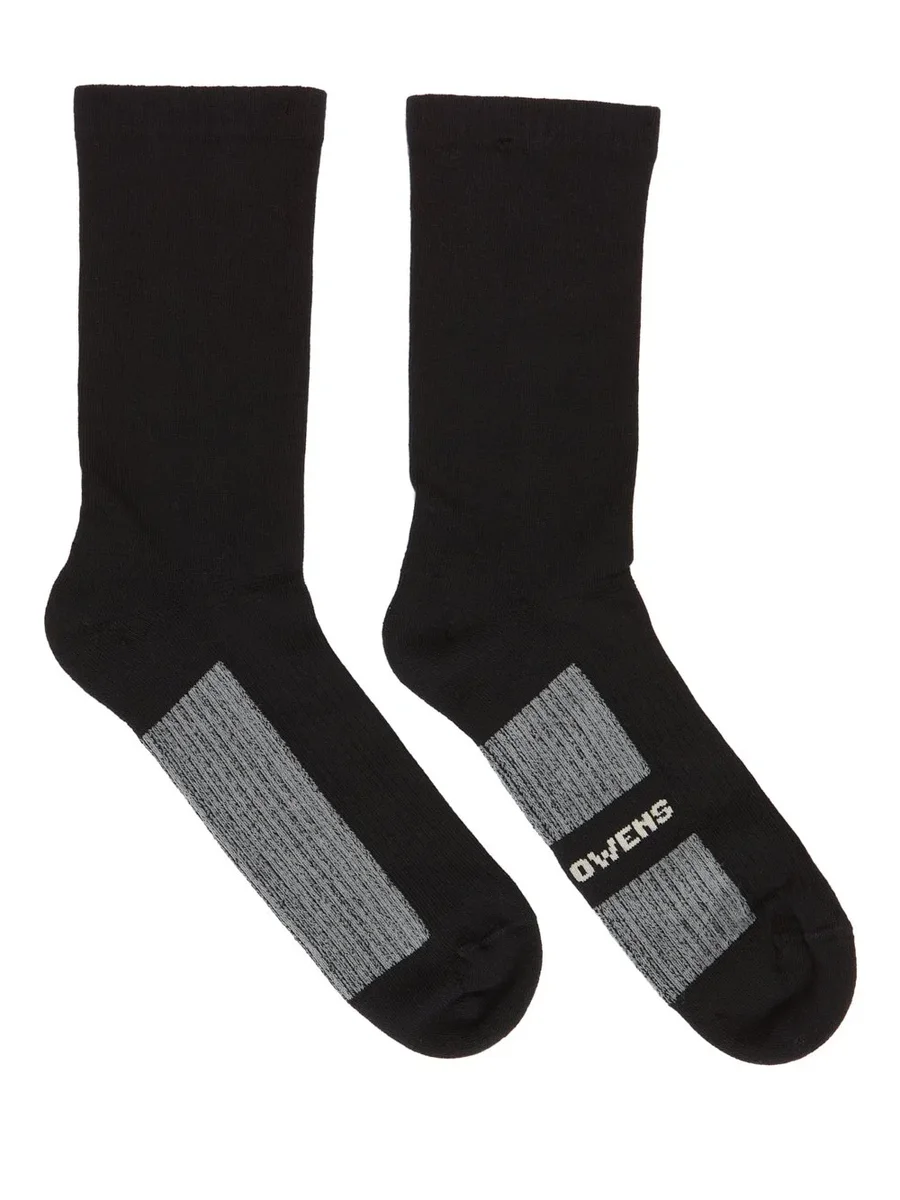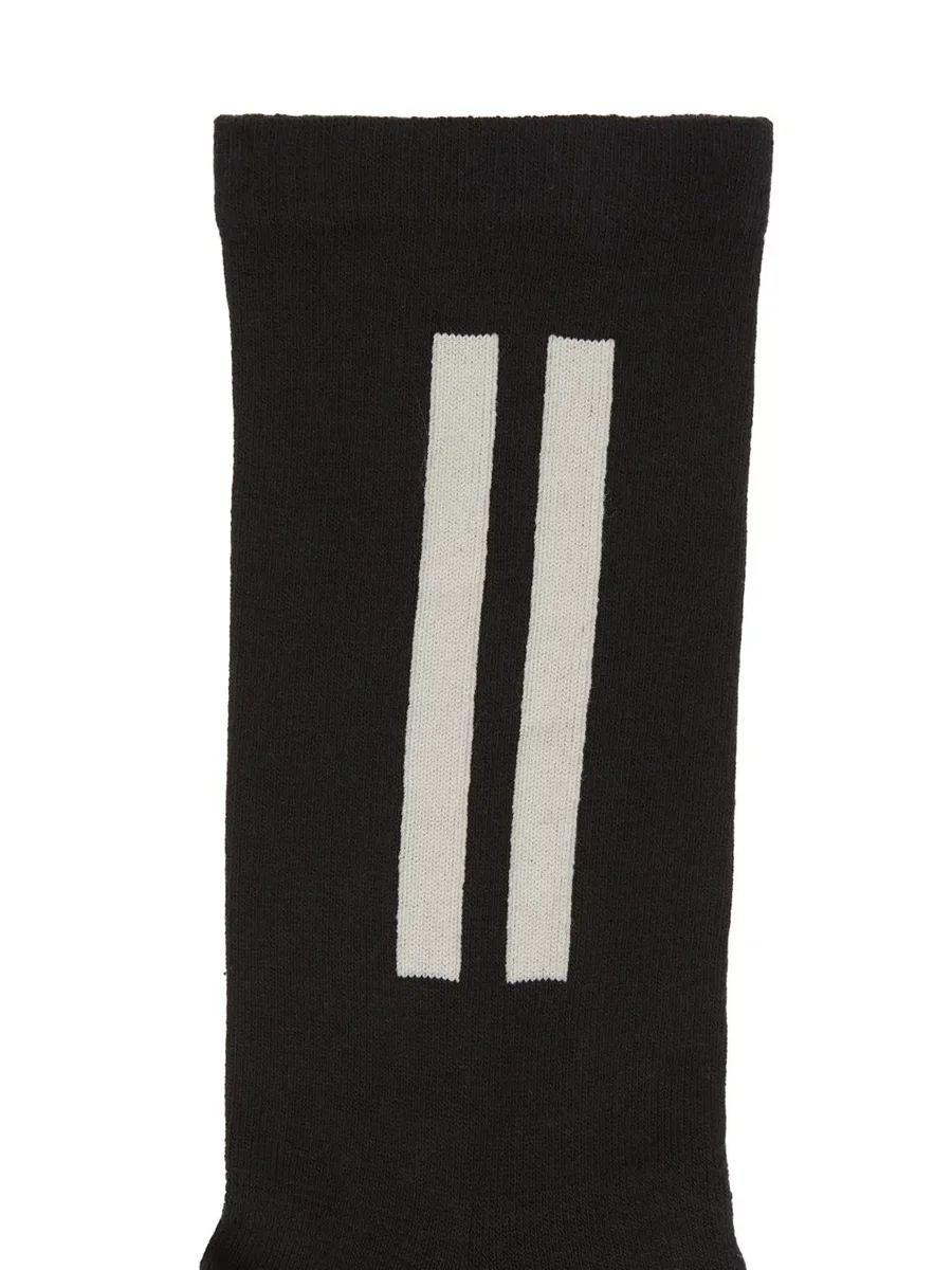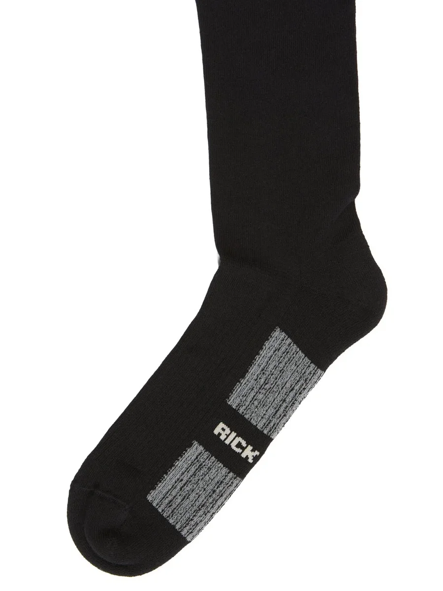 DEZE GLITTER SOKKEN ZIJN KORT. ZE HEBBEN KENMERKENDE DUBBELE LIJNEN OP DE BUITENKANT VAN DE LINKERSOK, DE WOORDEN “RICK OWENS” OP DE ONDERKANT VAN DE RECHTERSOK EN WITTE ZOLEN OP BEIDE.