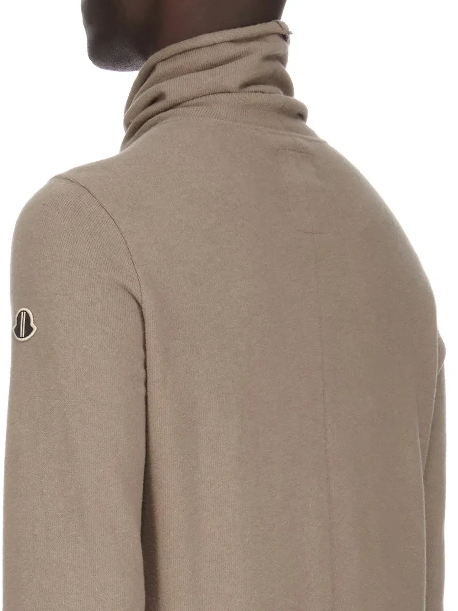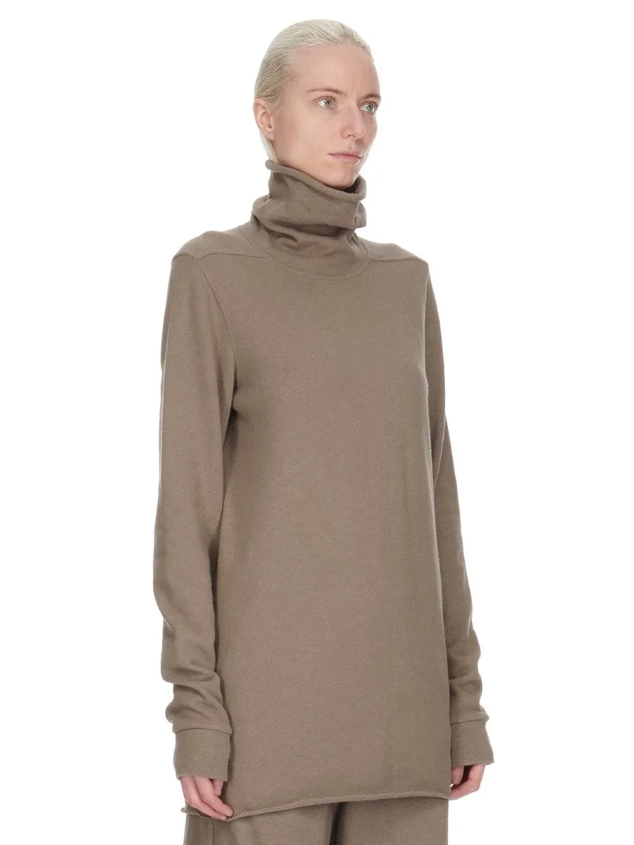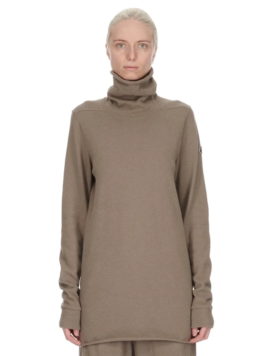 DIT SURF T-SHIRT IS ONDER DE HEUP, MET LANGE MOUWEN EN EEN LOSSE PASVORM. HET HEEFT EEN HOGE GERIBDE COLLECTIEKOP EN MANCHETTEN. HET HEEFT DE KENMERKENDE SCHOUDERNADEN EN EEN ENKELE NAAD DIE OVER HET MIDDEN VAN DE ACHTERKANT LOOPT. HET HEEFT DE GEBORDUURDE MONCLER + RICK OWENS LOGOPATCH OP DE LINKERBOVENARM.