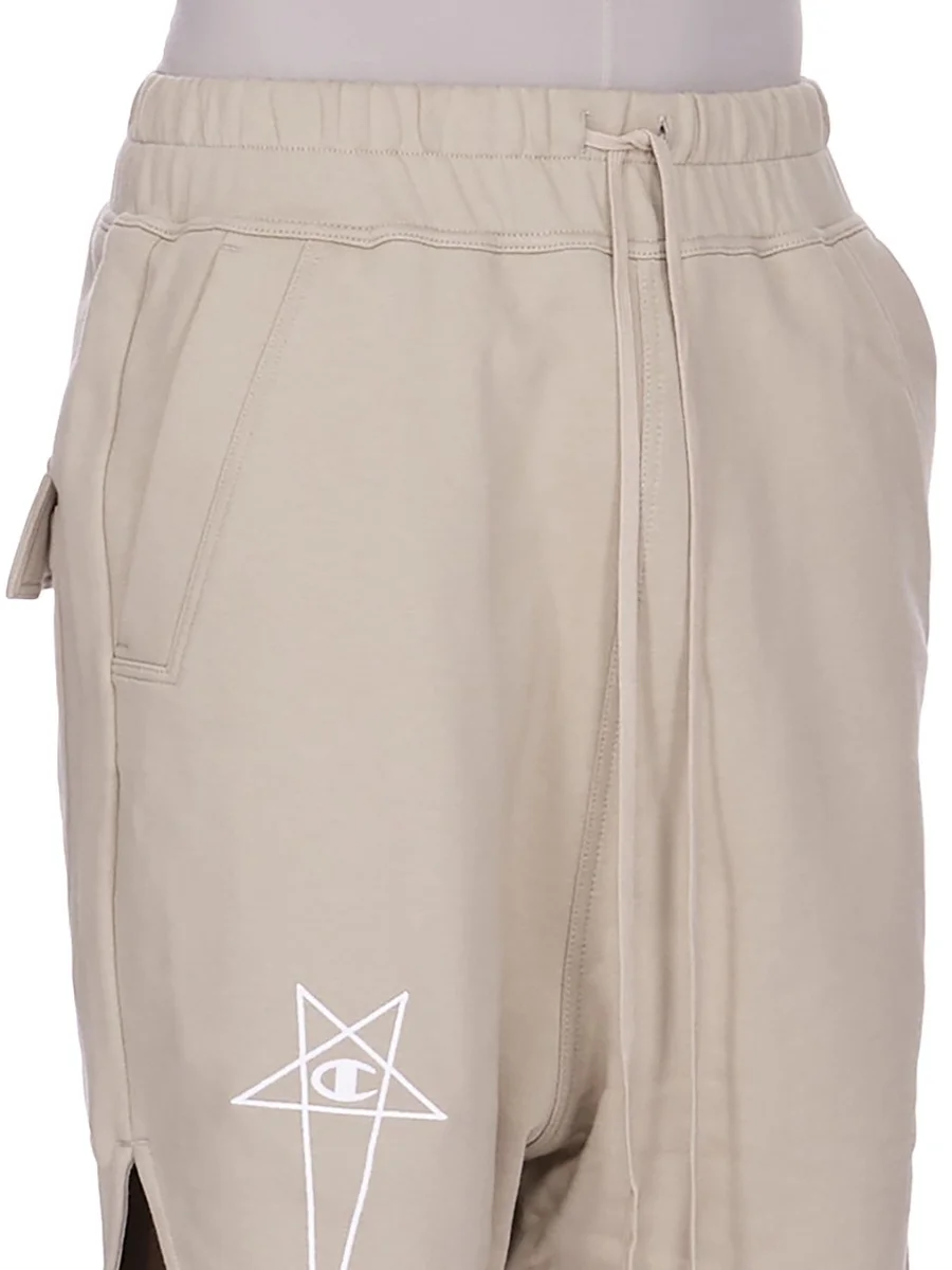 ZE HEBBEN EEN 3D GEBORDUURD CHAMPION X RICK OWENS PENTAGRAM LOGO OP DE VOORKANT EN EEN CHAMPION LOGO OP DE ACHTERKANT VAN DE HEUP.