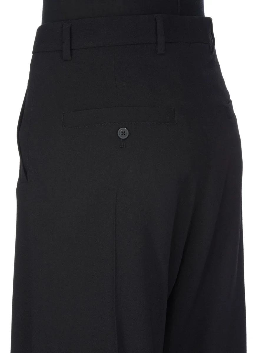 DEZE OP MAAT GEMAAKTE BREDE BELAS ZIJN LANGE LENGTE MET EEN LAAG KRUIS EN WIJDE PIJPEN. ZE HEBBEN EEN TAILLEBAND MET RIEMLUSSEN, KNOOPSLUITING EN EEN ZICHTBARE RITSSLUITING IN HET MIDDEN MET TWEE DRUKKEN AAN DE ONDERKANT. ZE HEBBEN ZIJZAKKEN MET KNOOP- EN OOGGEDETAILS EN TWEE ACHTERZAKKEN MET DRUKKEN EN DOORSTEKEN.