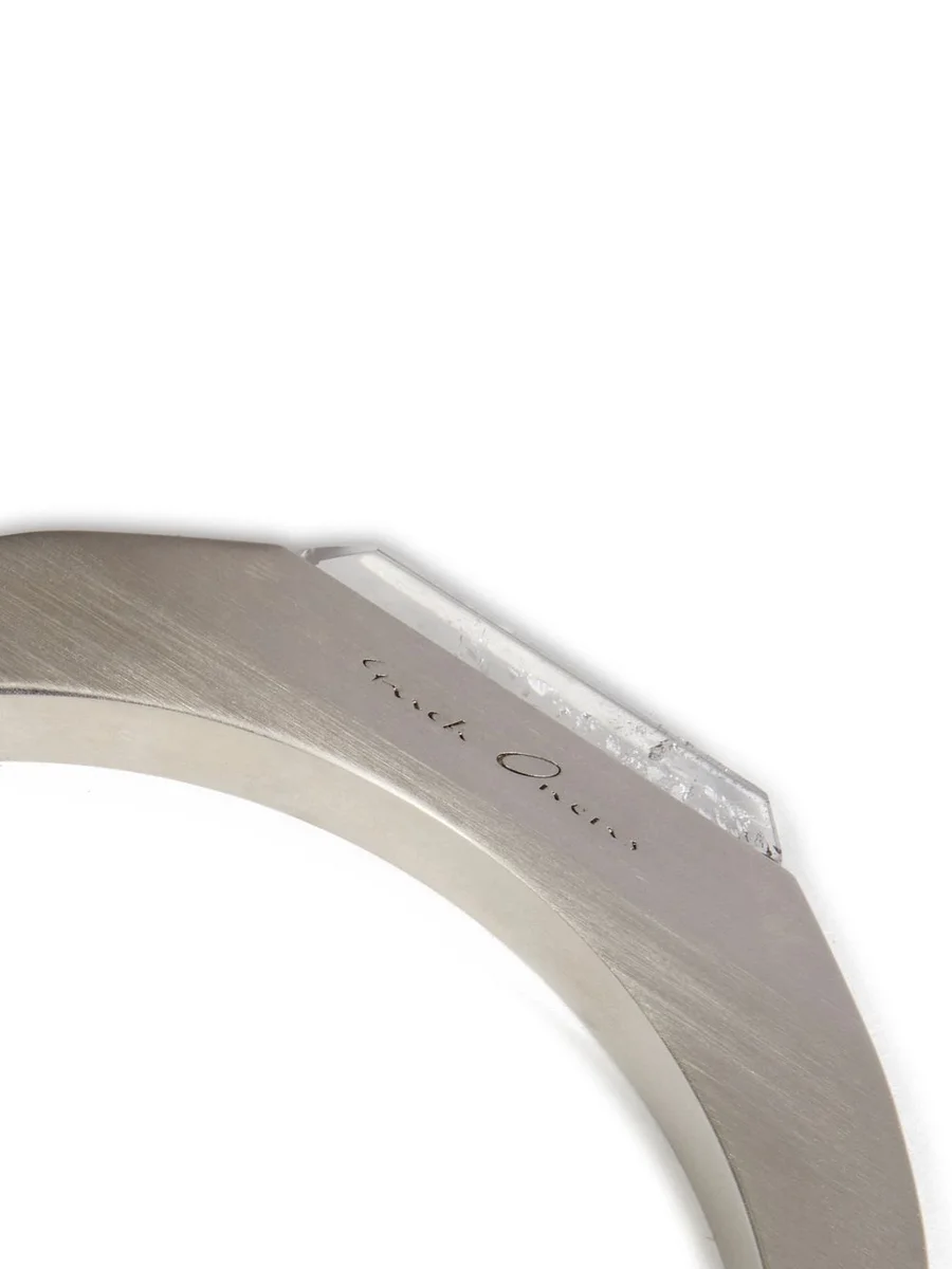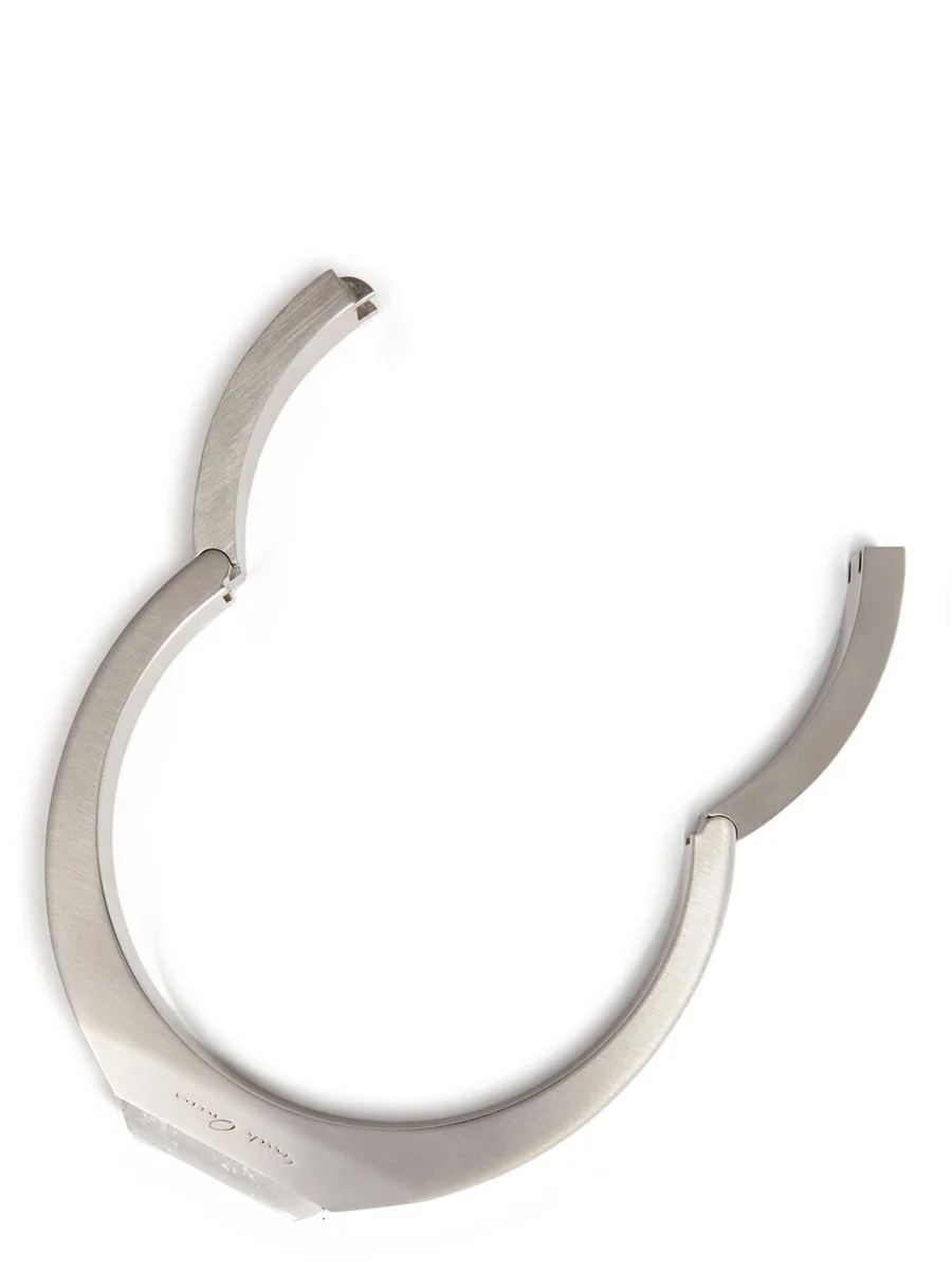 DEZE KRISTALLEN CHOKER MET AFGESCHUINDE RAND IS EEN MASSIEF METALEN CHOKER MET AFGESCHUINDE RANDEN, BEDOELD MET EEN BERGKRISTAL. DEZE HEEFT EEN MAGNETENSLUITING AAN DE ACHTERKANT EN HET RICK OWENS LOGO IS GEGRAVEERD IN DE ZIJKANT.