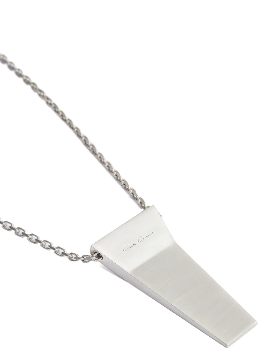 DEZE KETTING MET EEN KLEINE GEOMETRISCHE KOFFERVORMIGE BEDEL MET AFGESCHUINDE RANDEN, DIE AAN EEN KETTING HANGT. HET RICK OWENS-LOGO IS OP DE ACHTERKANT GEGRAVEERD.