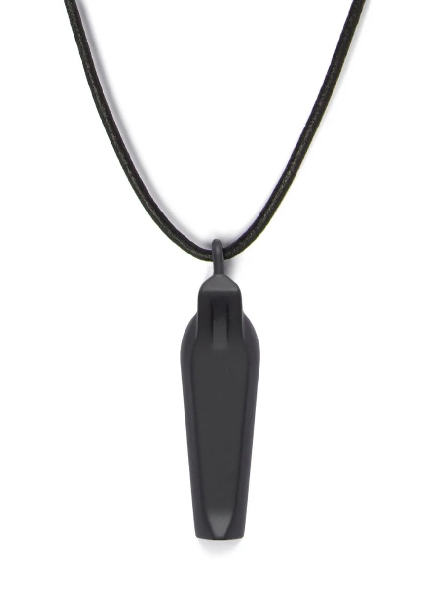 DEZE SARCOPHAGUS KETTING HEEFT EEN KLEINE SARCOPHAAG AAN EEN VERSTELBARE ZWARTE LEDEREN KETTING. HET RICK OWENS LOGO IS OP DE ACHTERKANT GEGRAVEERD.
