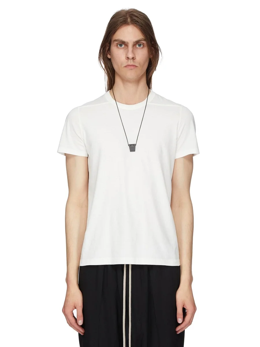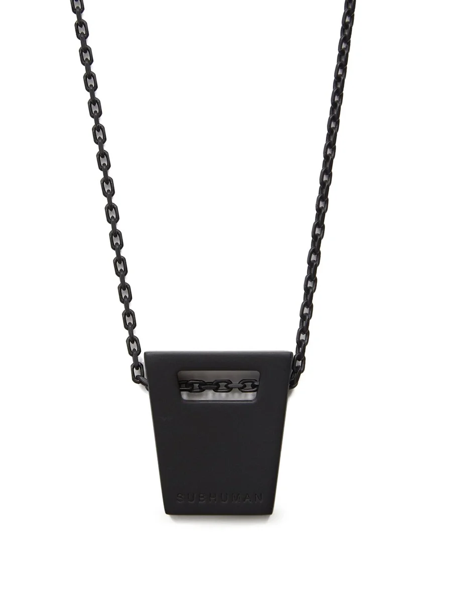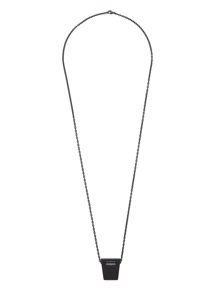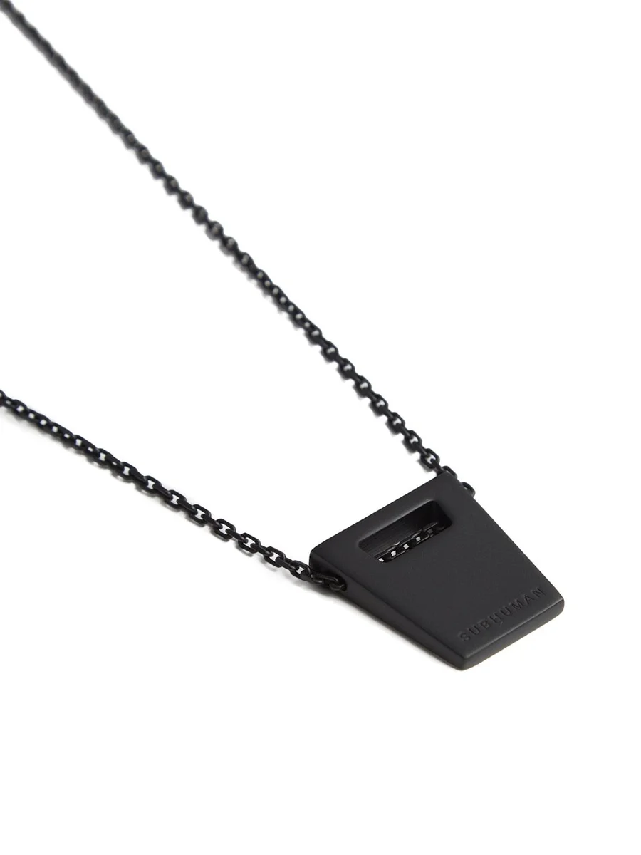 DEZE DOGTAG-CHANKETTING HEEFT EEN KLEINE GEOMETRISCHE KOFFERVORMIGE BEDEL MET DE GROEF SUPERHUMAN, DIE AAN EEN KETTING HANGT. OP DE ACHTERKANT IS HET RICK OWENS-LOGO GEGRAVEERD.