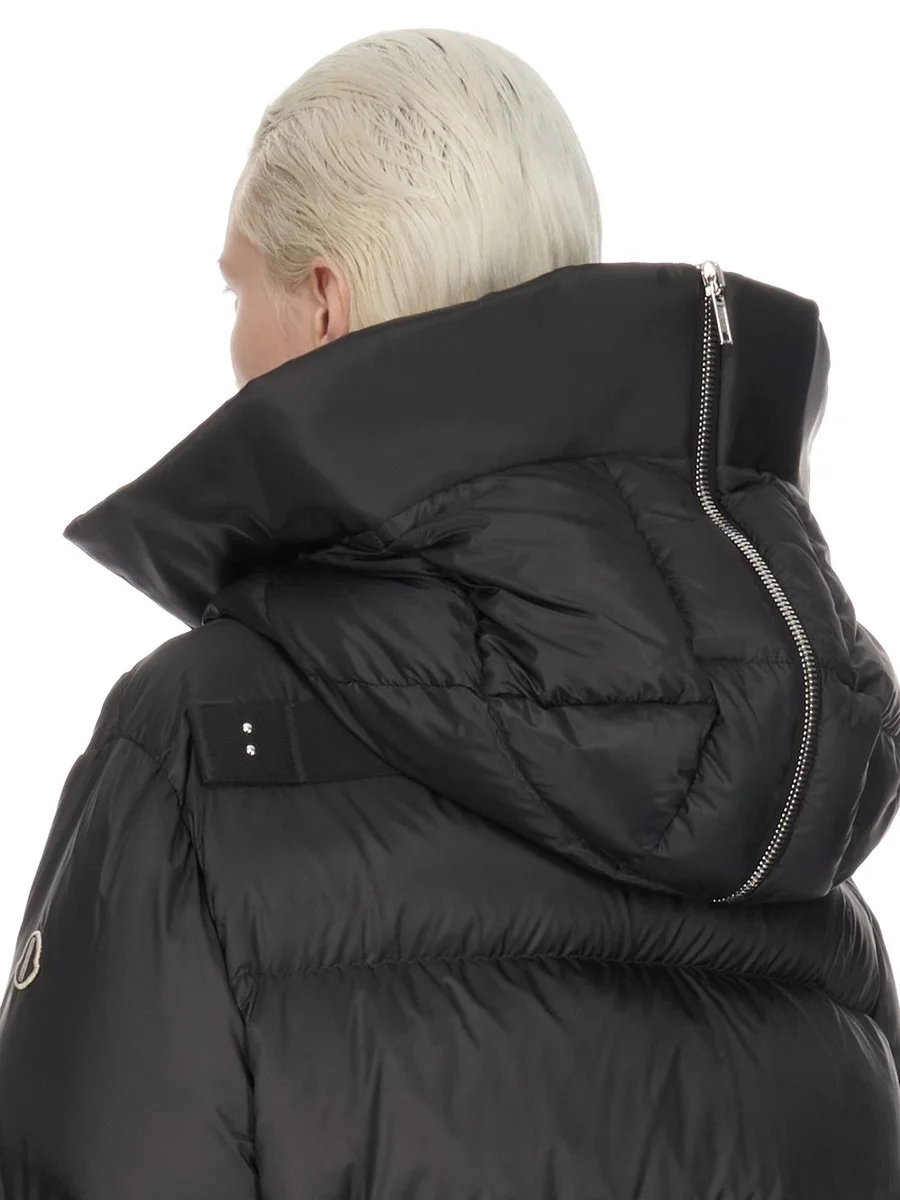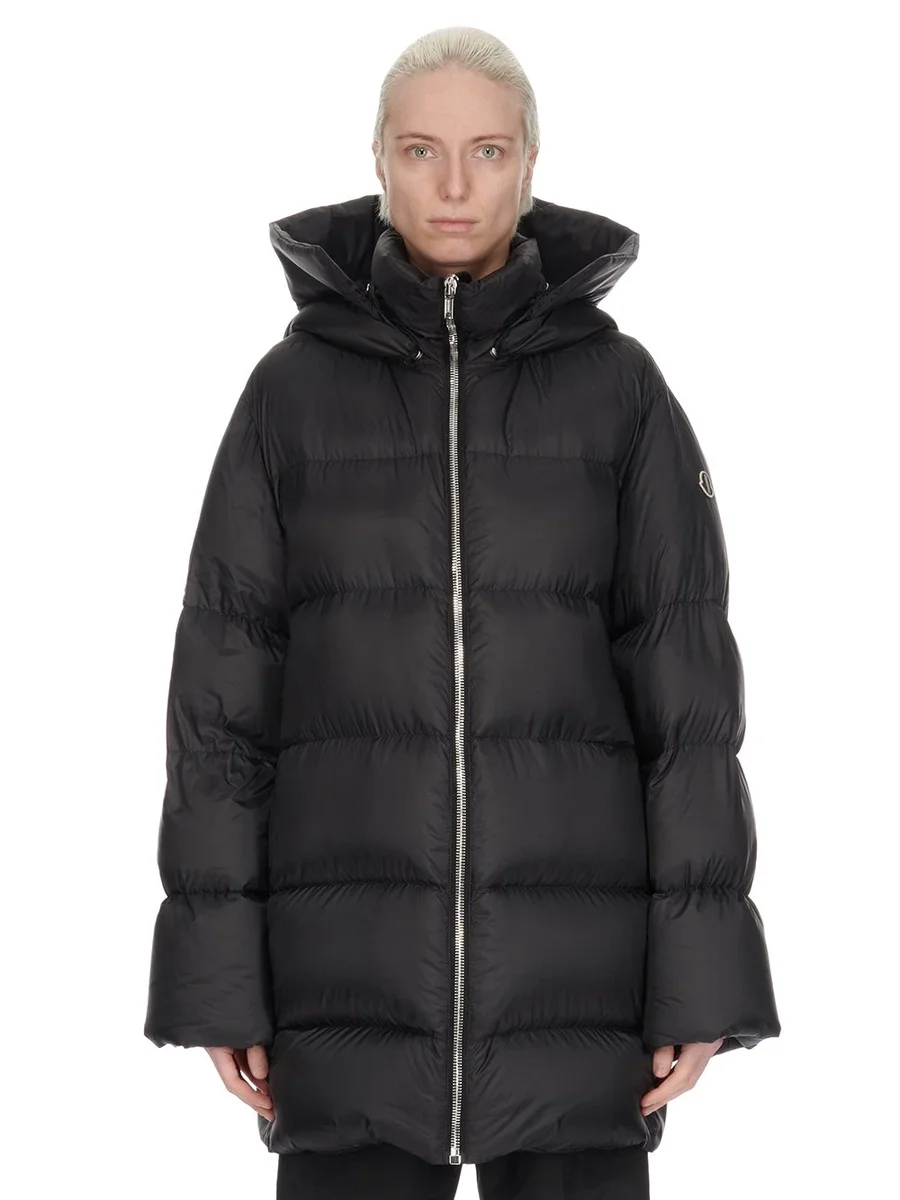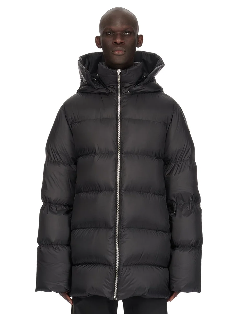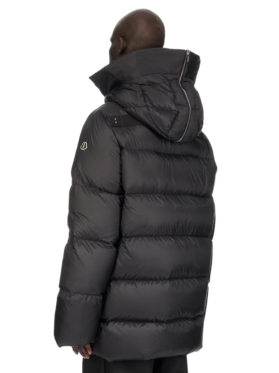 MONCLER + RICK OWENS FW24 CYCLOPISCHE JAS MET CAPUCHON IN ZWART GERECYCLED LONGUE SAISON