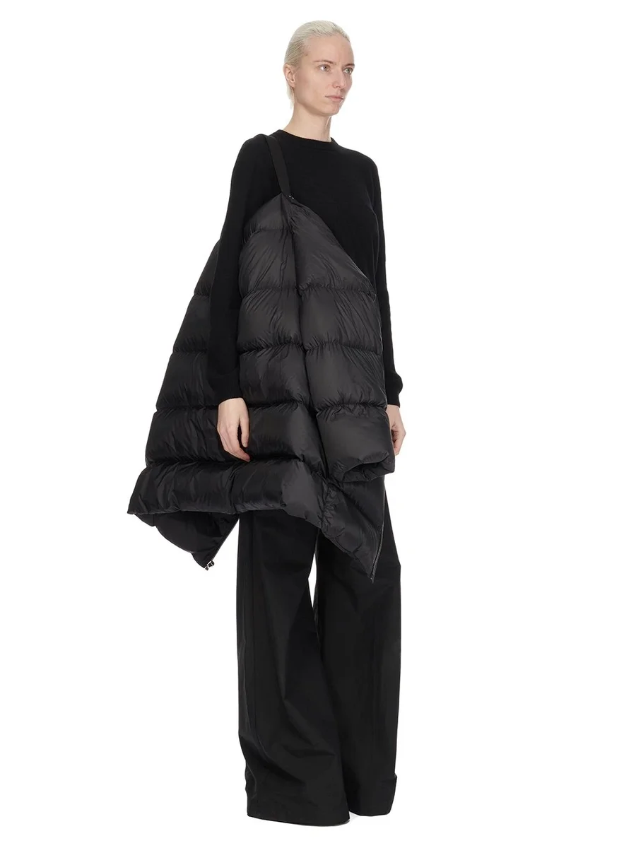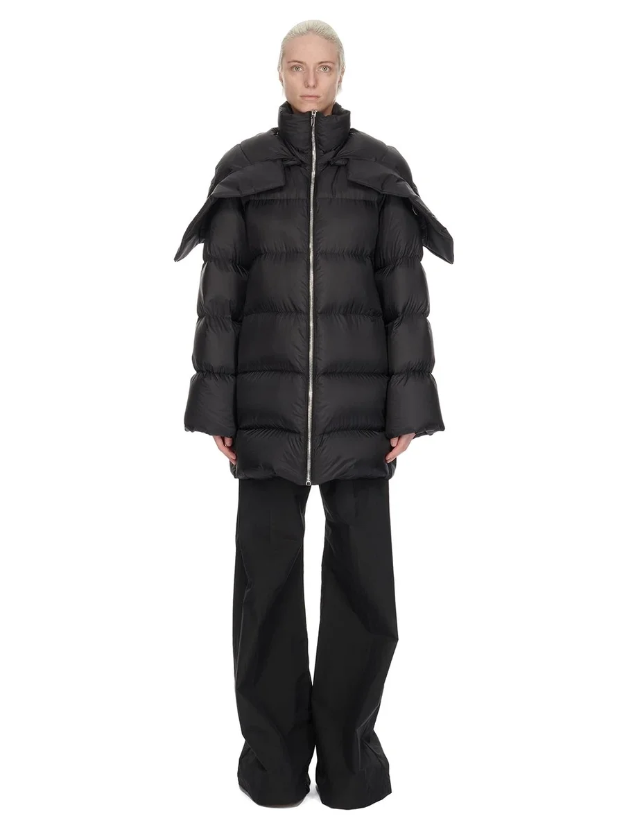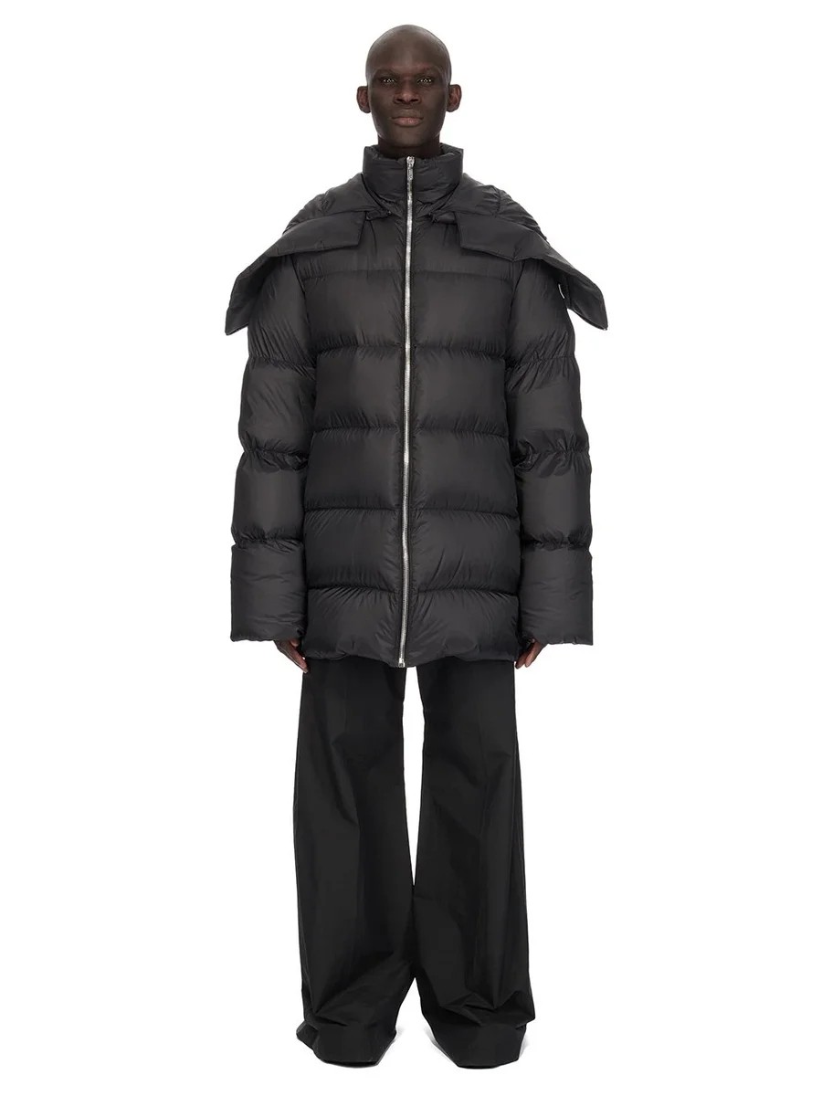 DEZE CYCLOPISCHE JAS MET CAPUCHON IS HALFHOOG, HEEFT EEN RITSSLUITING IN HET MIDDEN VAN DE VOORKANT EN EEN HOGE COLLIERKRAAG. HET IS EEN GEWATTEERD DEKBED, GEWATTEERD MET HORIZONTALE STIEKLIJNEN EN HEEFT ZIJZAKKEN MET DRUKKEN AAN DE VOORKANT. DE JAS HEEFT EEN GROTE CAPUCHON MET EEN RITSSLUITING IN HET MIDDEN DIE OPEN GEDRAGEN KAN WORDEN OM EEN GROTE KRAAG OVER DE SCHOUDERS TE CREËREN. DE JAS IS VOORZIEN VAN EEN KENMERKENDE KATOENEN BAND MET KNIPSELS OP HET ACHTERPAK. HET HEEFT TWEE BINNENZAKKEN MET DRUKKEN EN EEN GEBORDUURDE MONCLER + RICK OWENS LOGO PATCH OP DE BOVENKANT VAN DE LINKERARM.