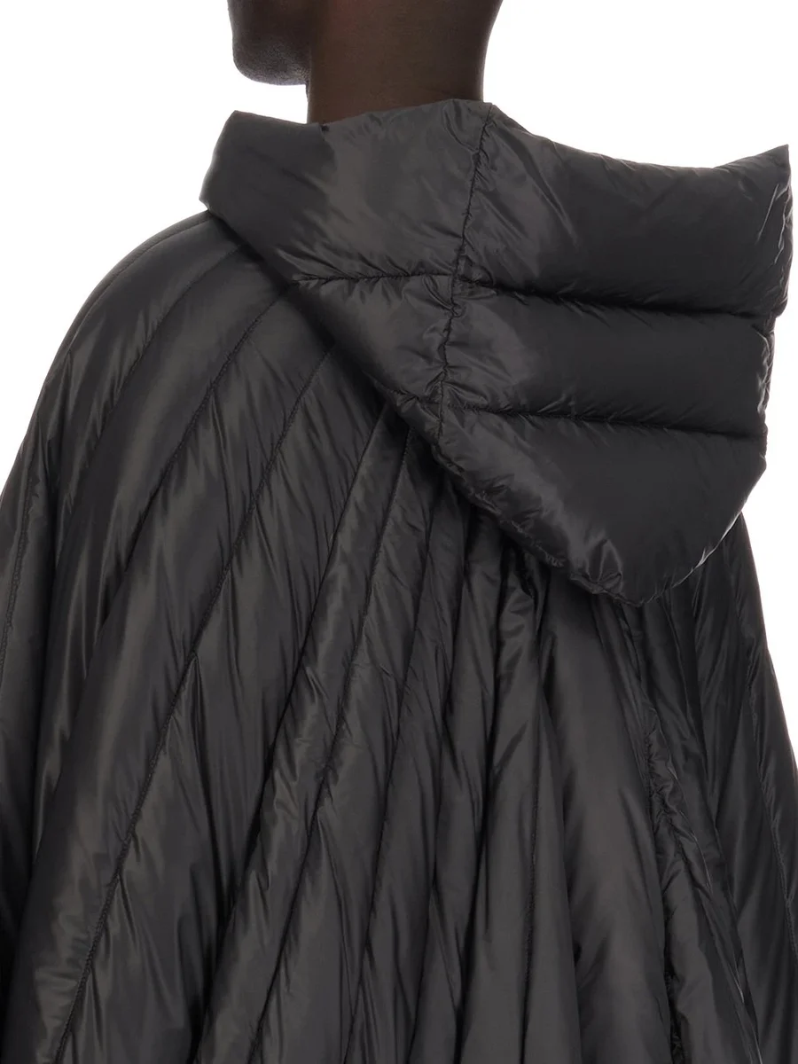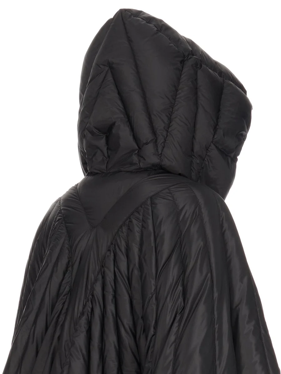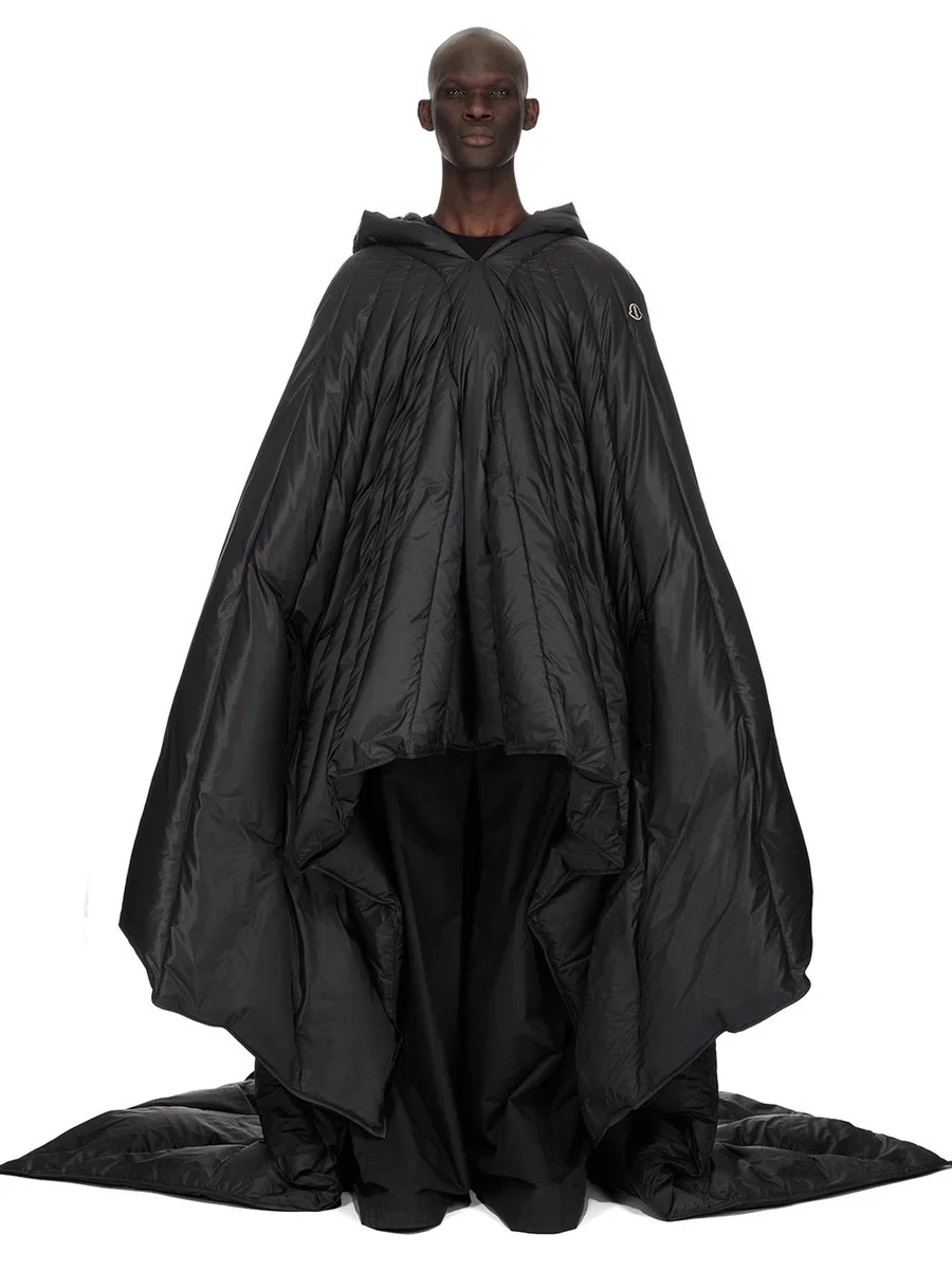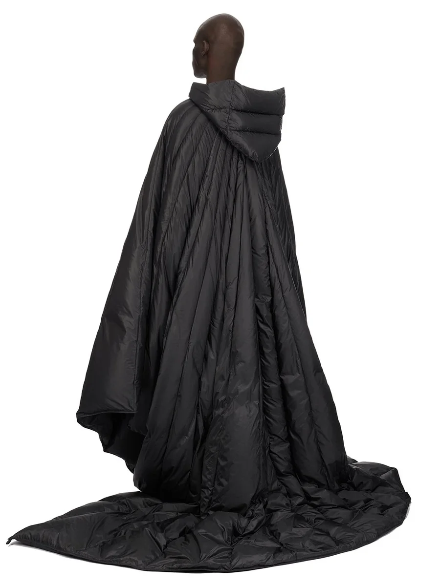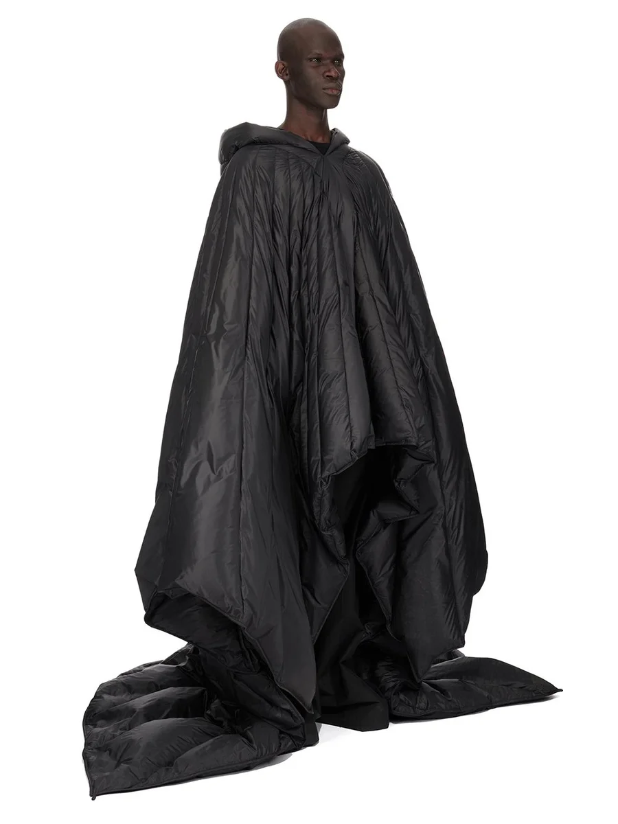 DEZE DEKEN MET CAPUCHON RAAKT TOT OP DE VLOER. HET IS EEN GROTE RECHTHOEKIGE VORM MET EEN OPENING IN HET MIDDEN MET EEN CAPUCHON DIE OVER HET HOOFD WORDT GEDRAGEN ALS EEN PONCHO. DEZE DEKEN LOOPT OVER DE SCHOUDERS EN CREËERT EEN ZOOM DIE AAN DE ZIJKANTEN AFVALT. HET IS EEN DEKBEDMODEL MET EEN RADIANCE QUILTING ONTWERP, MET LIJNEN DIE VAN DE SCHOUDERS AFSTRALEN EN NAAR DE ZOOM UITLOPEN. HET HEEFT DE GEBORDUURDE MONCLER + RICK OWENS LOGOPATCH OP DE BOVENKANT VAN DE LINKERARM.