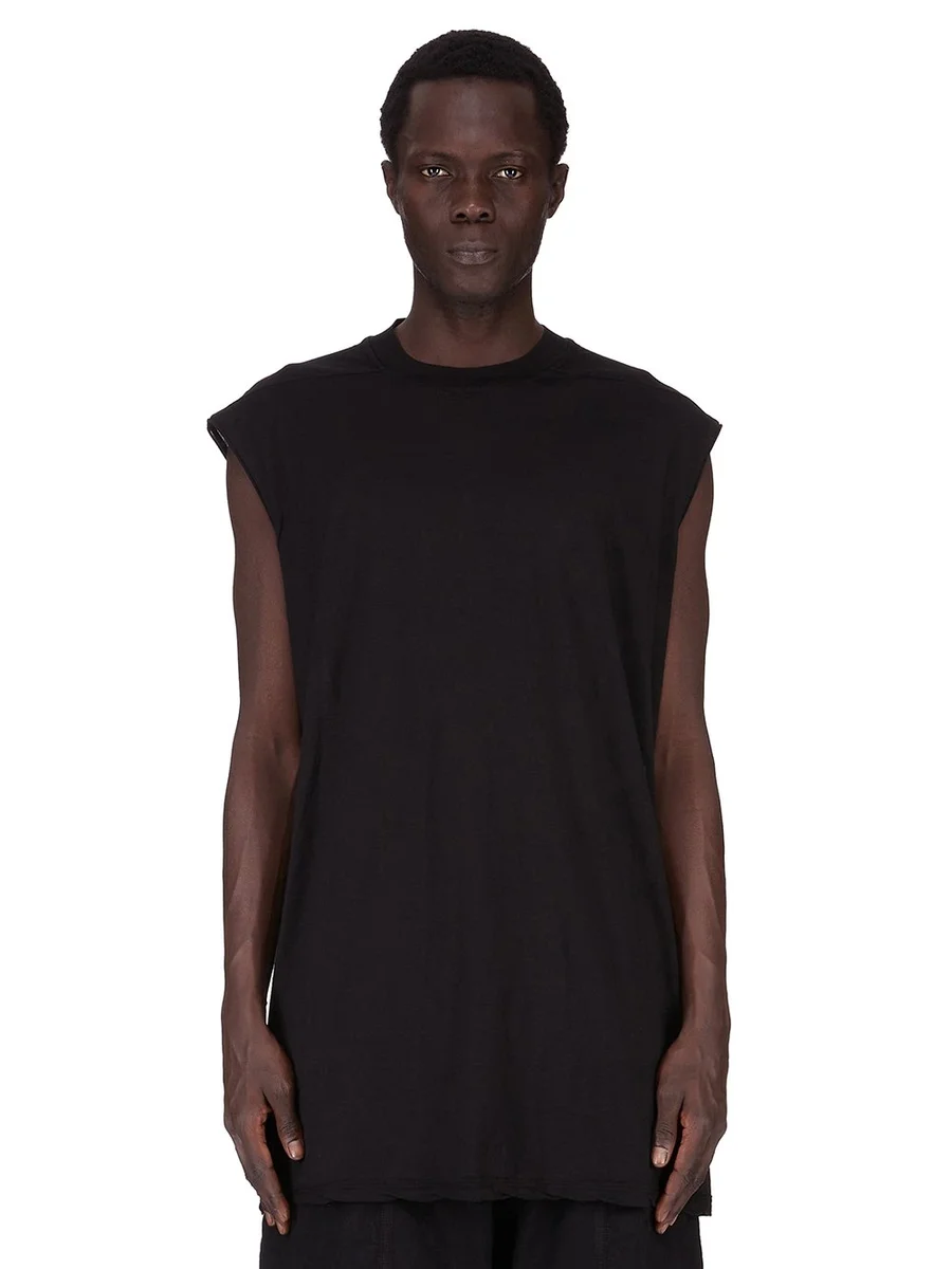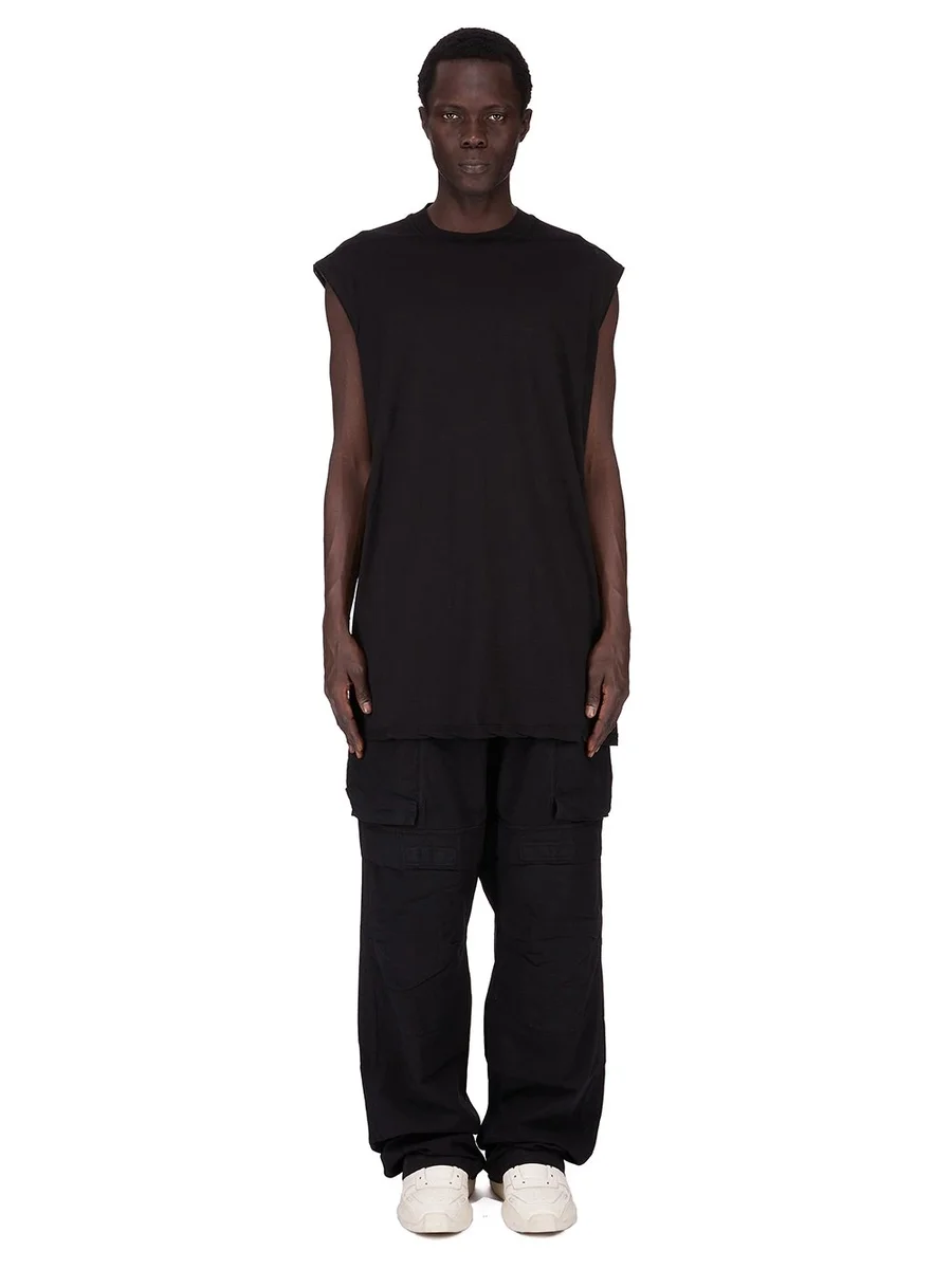 Dit TARP T-shirt valt onder de heupen en heeft een losse pasvorm. Het is mouwloos, heeft brede schouders en een geribbelde ronde hals. Het heeft kenmerkende schoudernaden aan de voorkant en een enkele naad die over het midden van de rug loopt.