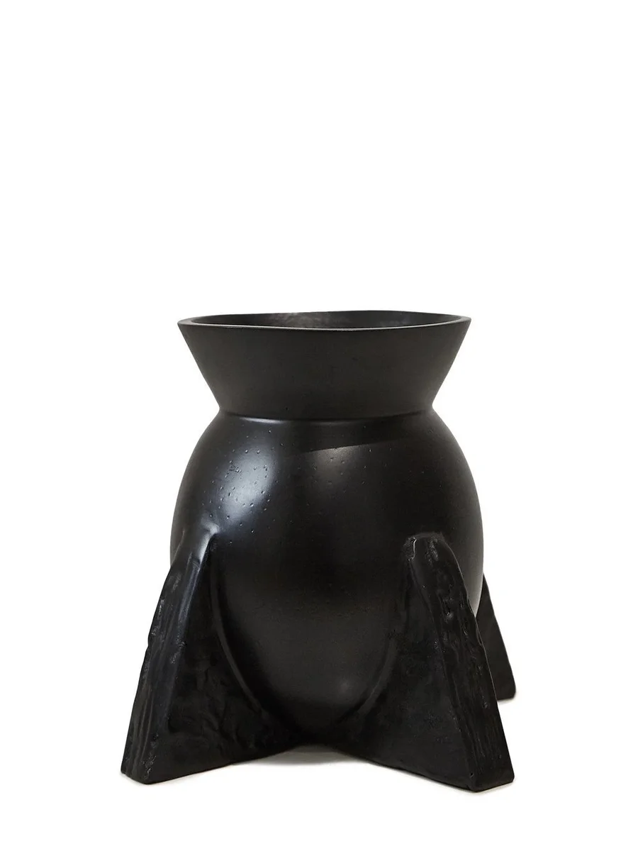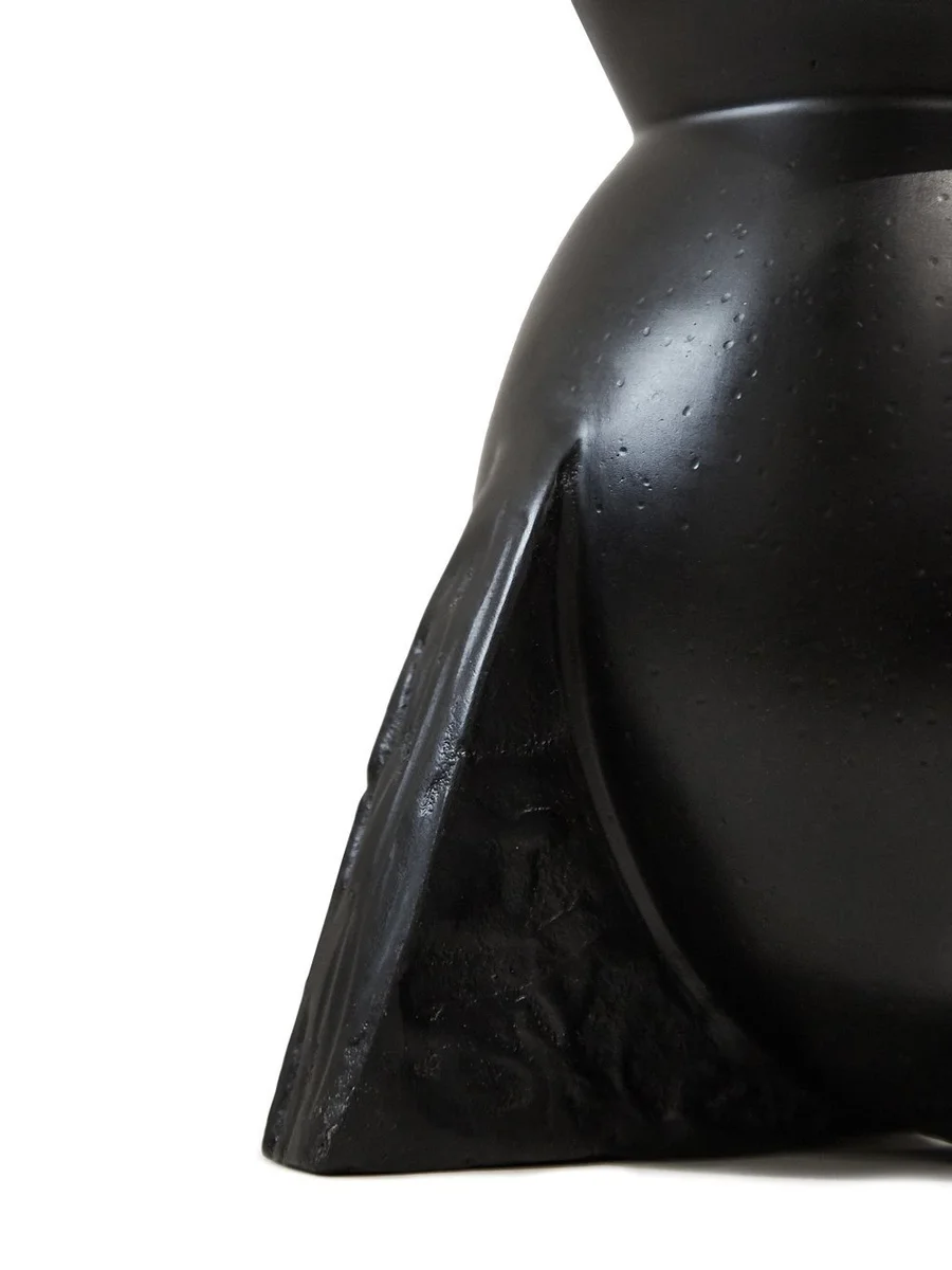 RICK OWENS EVASE IN ZWART BRONS HEEFT EEN OVALE VORM, EEN BREDE TRECHTERVORMIGE HALS, VIER POTEN EN EEN LICHT ONREGELMATIG OPPERVLAK.