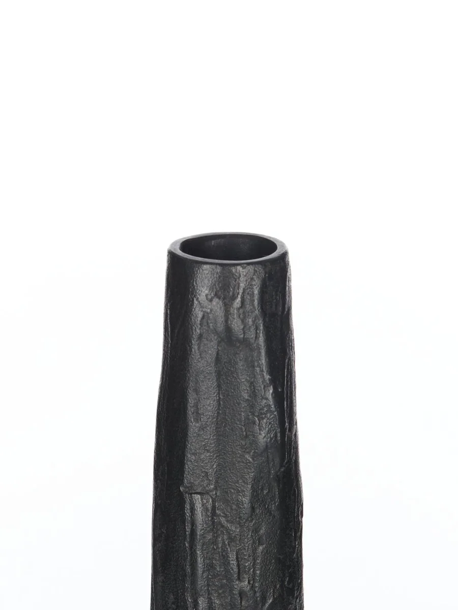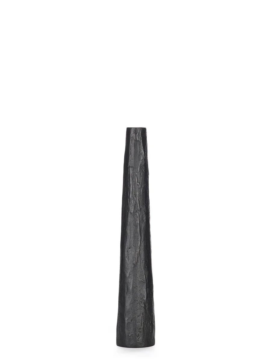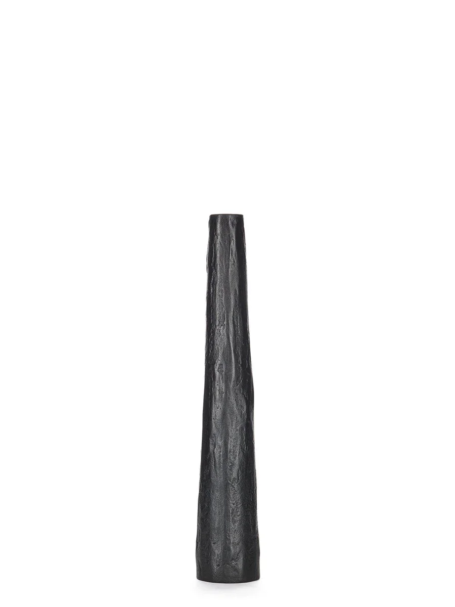 RICK OWENS KAARSPIJLER IN ZWARTBRONS HEEFT EEN SLANKE AFGEKOPTE VORM EN EEN LICHT ONREGELMATIG OPPERVLAK.