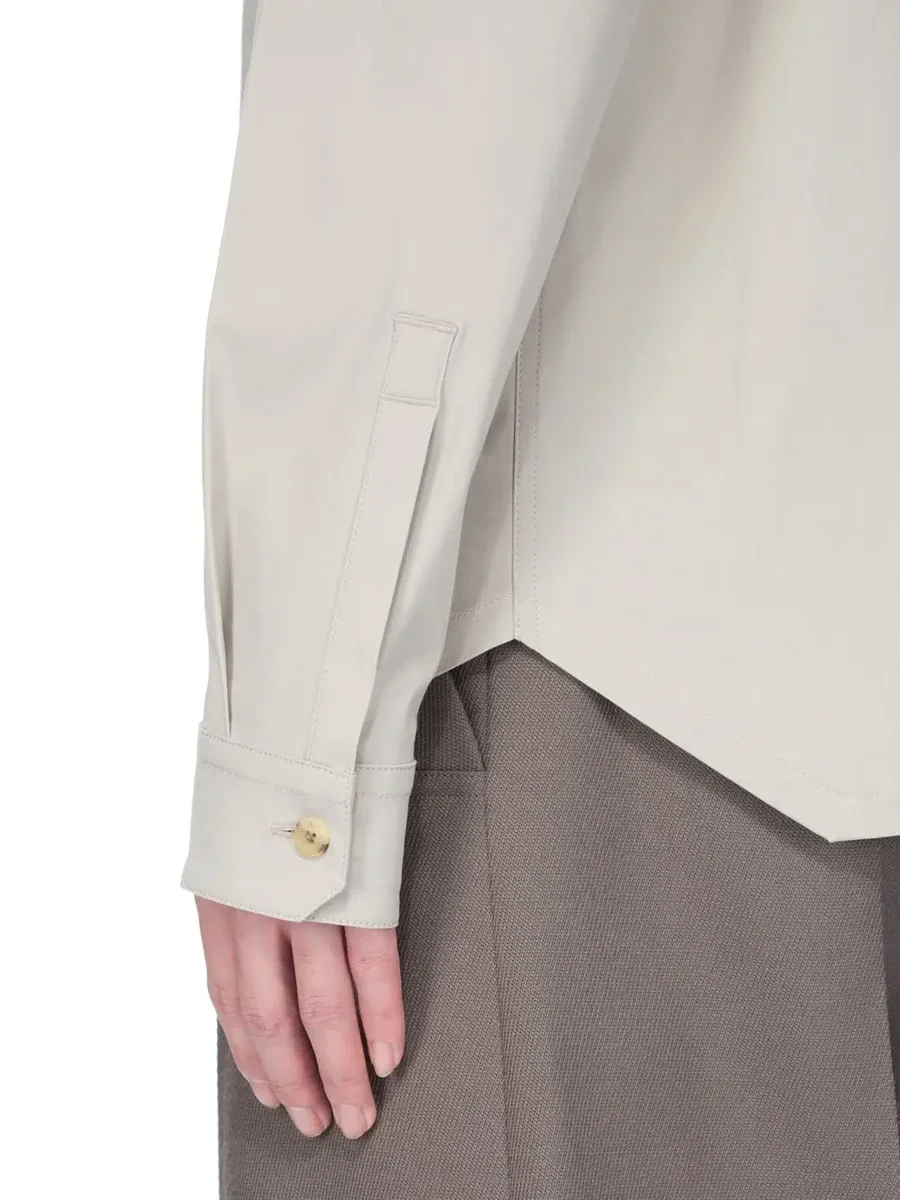 DIT WERKOVERHEMD IS HEUPLENGTE MET LANGE MOUWEN EN MANCHETTEN MET ÉÉN KNOOP. HET HEEFT EEN OPENING AAN DE VOORKANT MET VERBORGEN KNOOPSLUITINGEN, ÉÉN ZICHTBARE BOVENKNOP, EEN KLASSIEKE KRAAG, GELIJKE SCHOUDERNADEN EN EEN ACHTERPAK. HET HEEFT TWEE BORSTZAKKEN EN EEN ZOOM MET AFGESCHUINDE ZIJSPLITS.