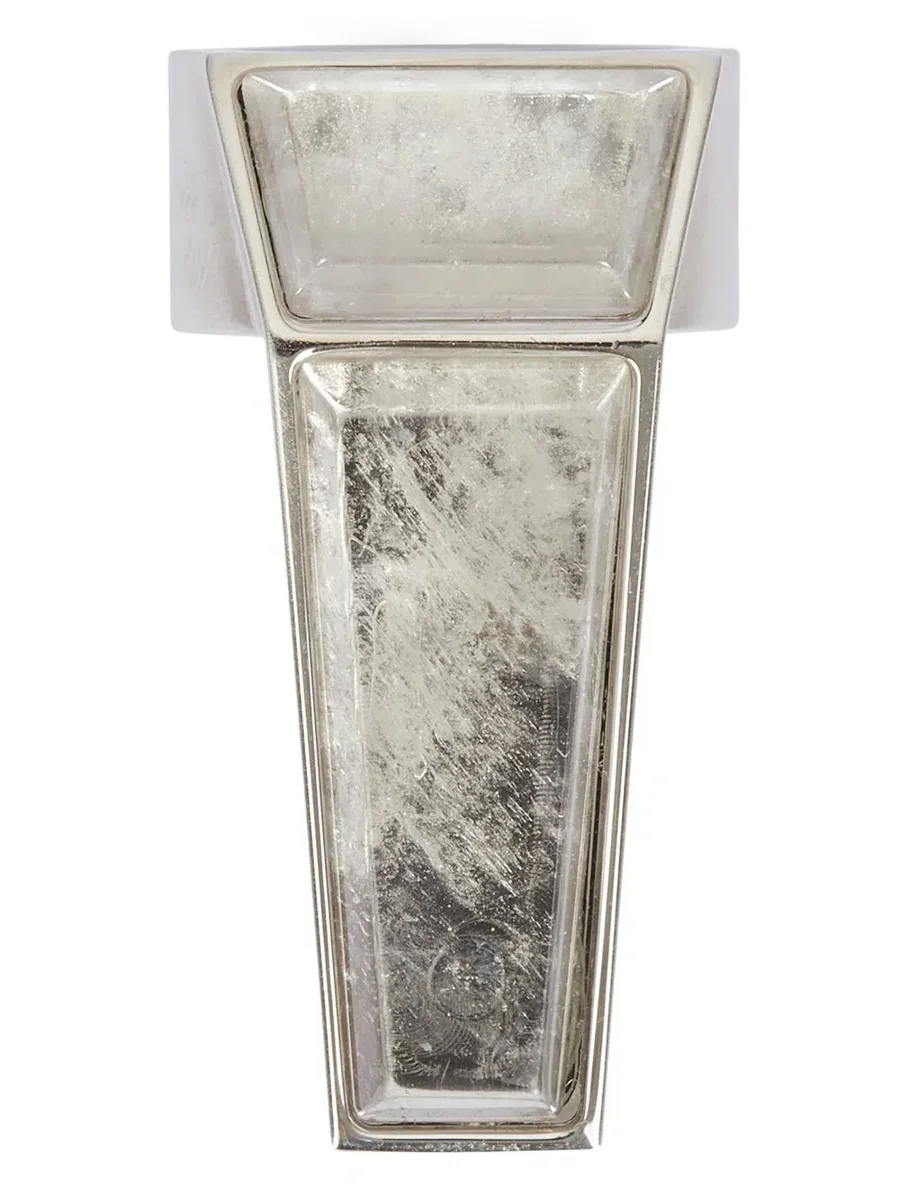 DEZE KRISTALLEN RING IS EEN DIKKE BAND DIE UITSTREKT TOT EEN GEOMETRISCHE VORM VAN DE SCHOMMEL MET AFGESCHUINDE RANDEN, VERSIERT MET TWEE RECHTHOEKIGE BERGKRISTALLEN EN HET RICK OWENS LOGO GEGRAVEERD OP DE ACHTERKANT.