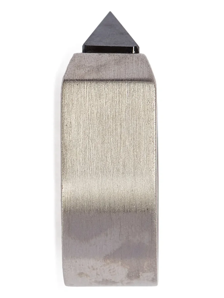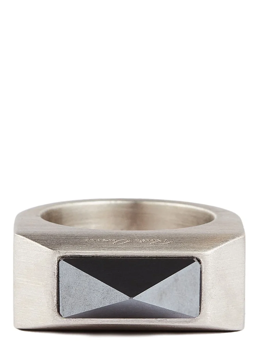 DEZE KRISTALLEN PIRAMIDE RING IS EEN DIKKE BAND MET AFGESCHUINDE RANDEN, BEDOELD MET EEN PIRAMIDEVORMIGE HEMATIET KRISTALSTEEN. HET RICK OWENS LOGO IS IN DE ZIJKANT GEGRAVEERD.