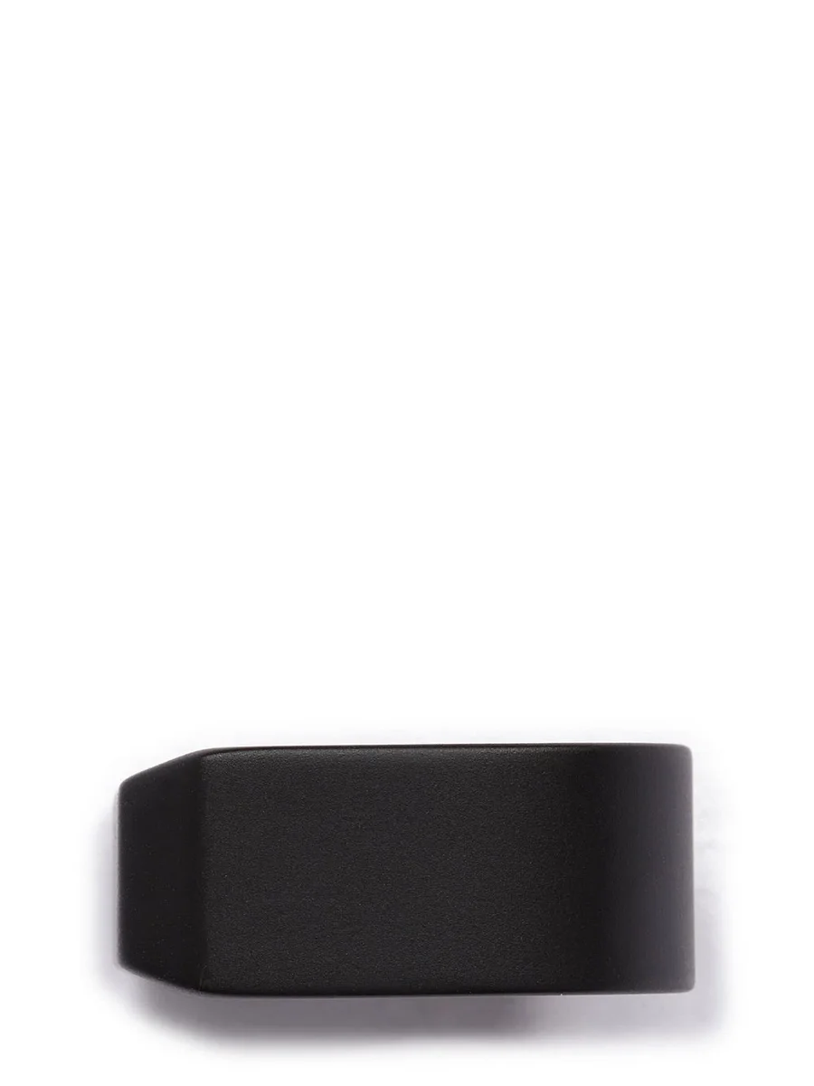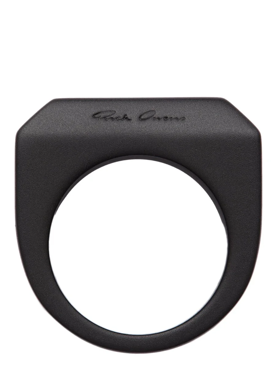 DEZE AFGESCHUINDE RING IS EEN DIKKE BAND MET AFGESCHUINDE RANDEN. OP DE ACHTERKANT IS HET RICK OWENS-LOGO GEGRAVEERD.