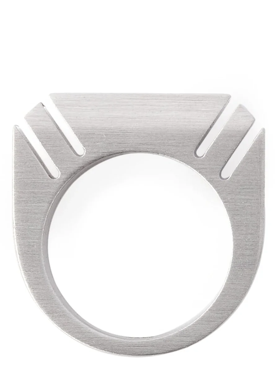 DEZE AFGESCHUINDE RING IS EEN DIKKE BAND MET AFGESCHUINDE RANDEN WAARIN DIAGONALE SNIJDEN ZIJN GEMAAKT. OP DE ACHTERKANT IS HET RICK OWENS-LOGO GEGRAVEERD.
