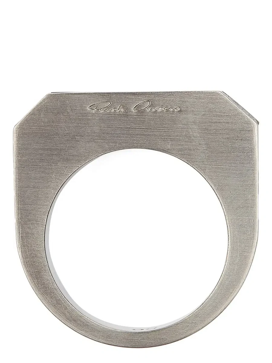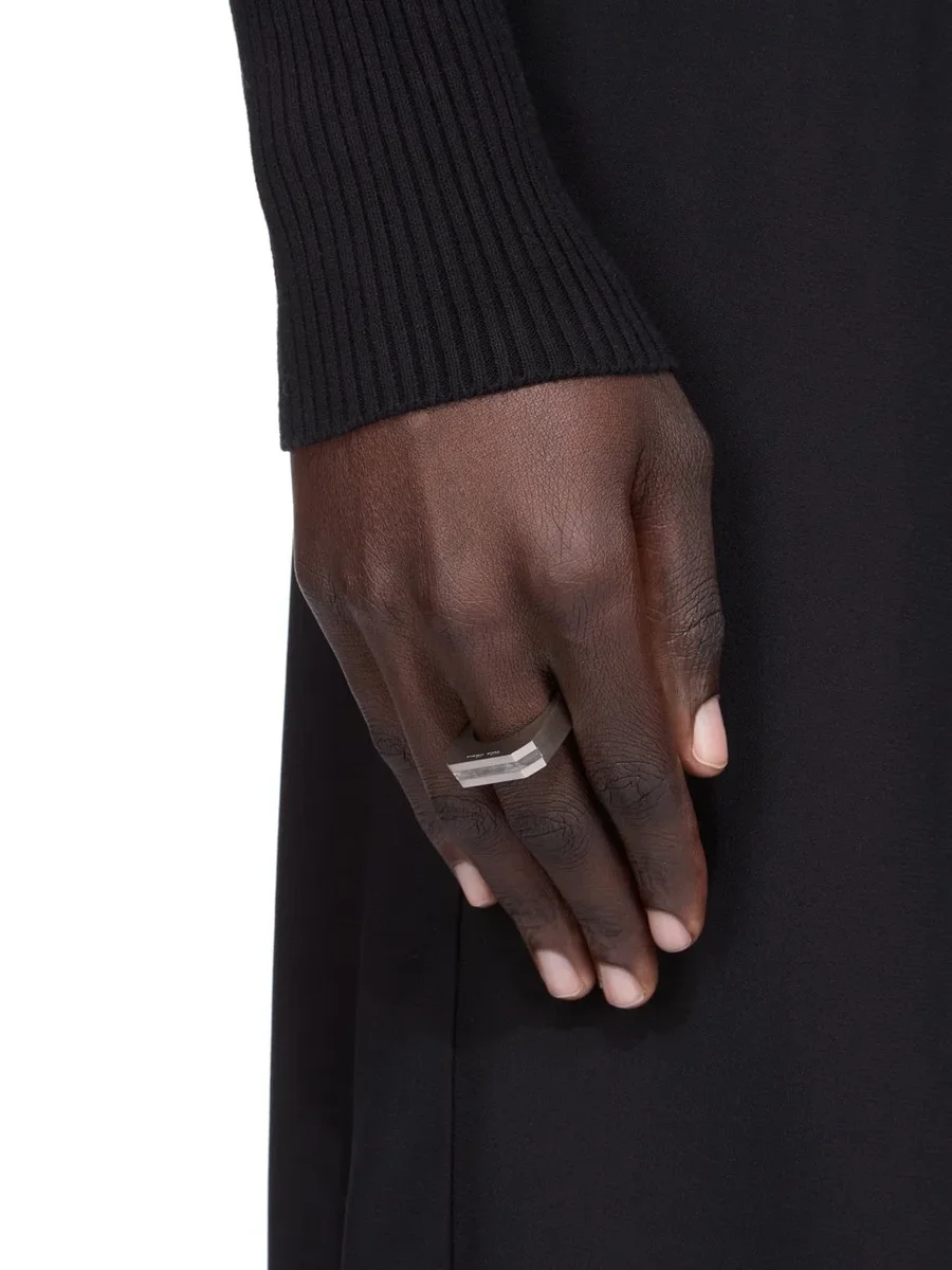 DEZE AFGESCHUINDE RING IS EEN DIKKE BAND MET AFGESCHUINDE RANDEN. OP DE ACHTERKANT IS HET RICK OWENS-LOGO GEGRAVEERD.