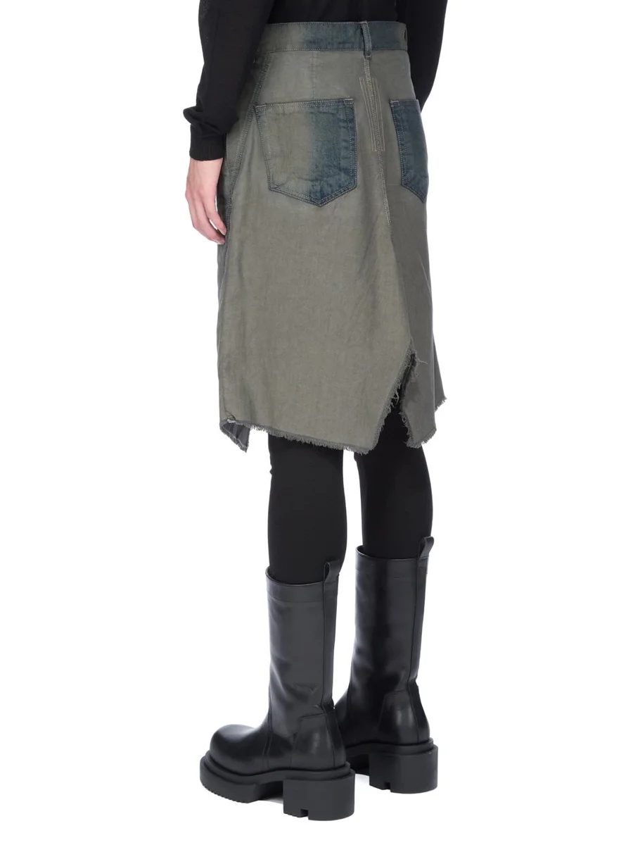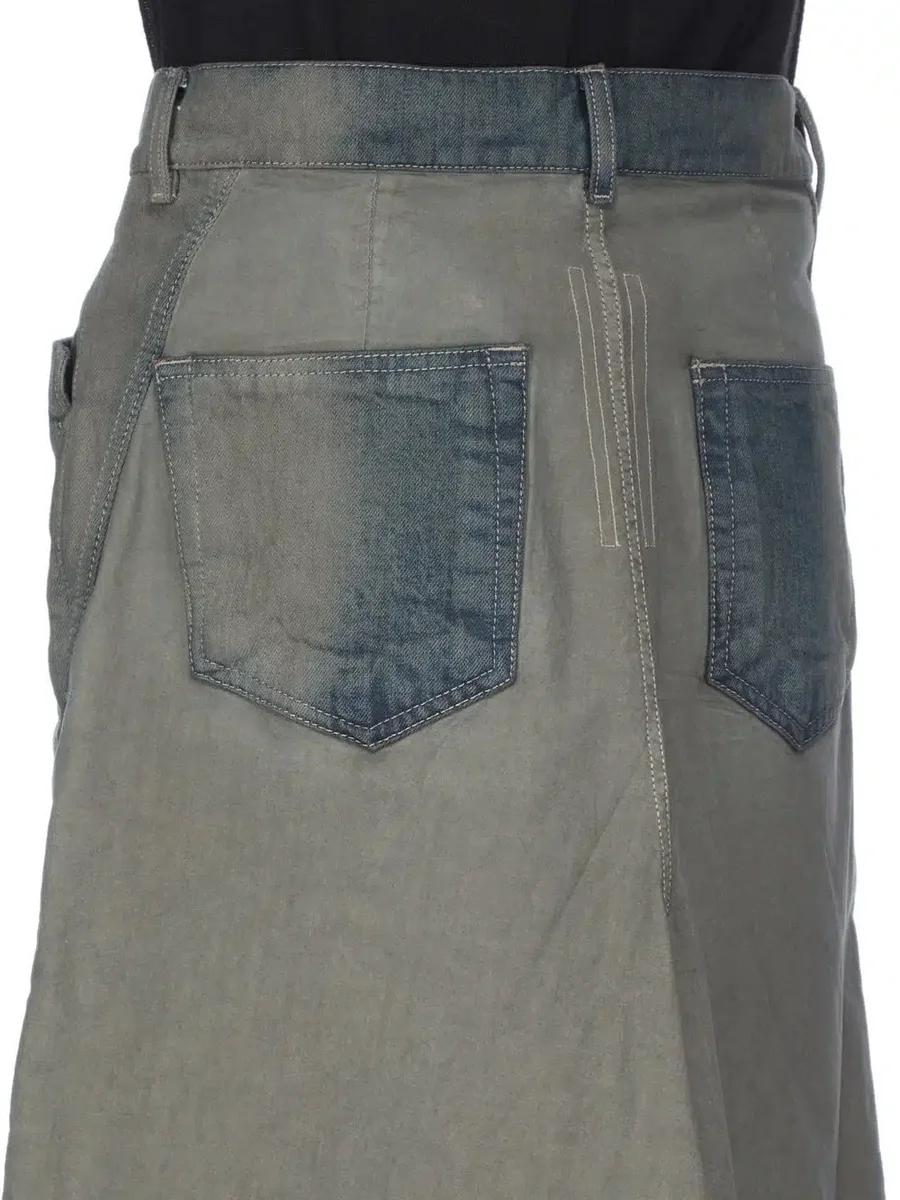DEZE SLIVERED ROK IS EEN KNIE-LENGTE JEANSROK MET 5 ZAKKEN. DEZE ROK HEEFT EEN TAILLEBAND MET EEN VERBORGEN RITSSLUITING, EEN BOVENSTE KNOOP, RIEMLUSSEN MET KNOPEN EN HOEKIGE ZAKKEN AAN DE VOORKANT. DE ROK KOMT IETS TUSSEN DE BENEN UIT, LOOPT TAPSE NAAR DE KNIE EN HEEFT HOEKIGE GEO-PANELEN OP DE VOORKANT VAN DE DIJEN.