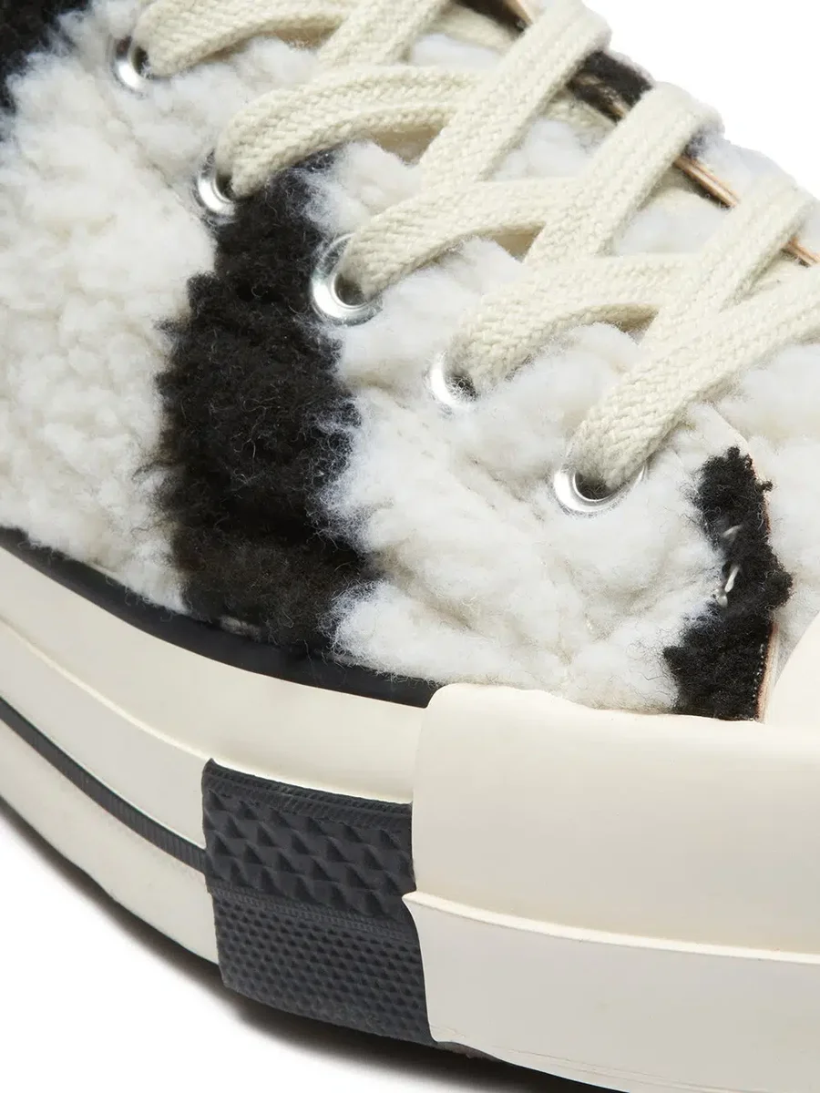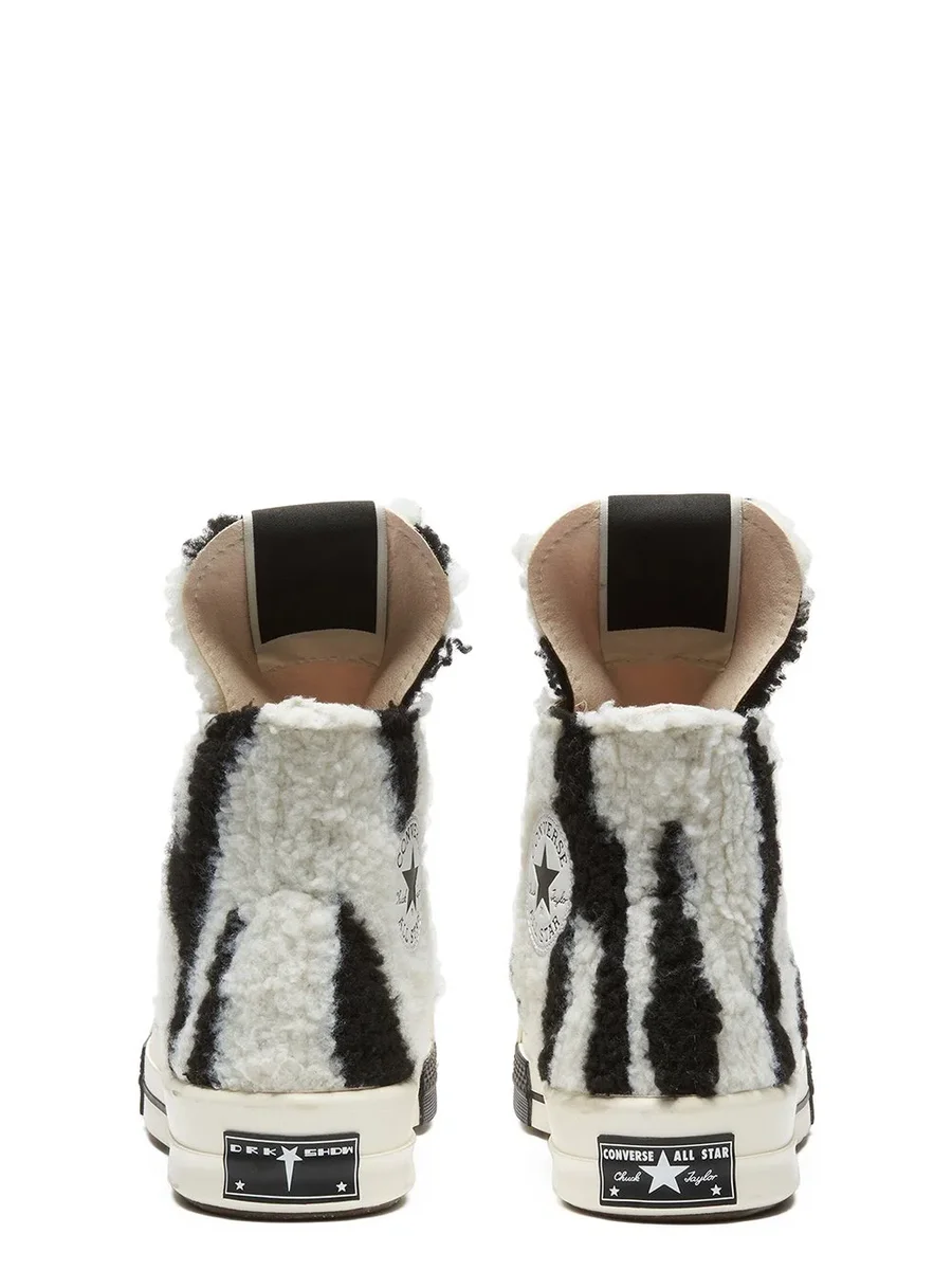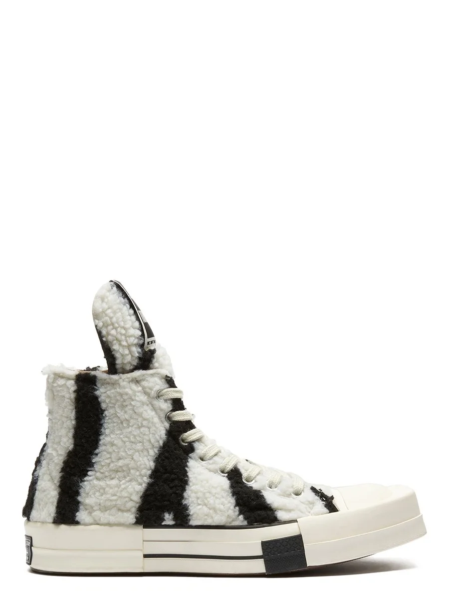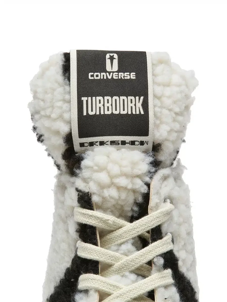 DEZE CONVERSE X DRKSHDW TURBODRK HI ZIJN ZEBRA-GEÏNSPIREERDE HIGH-TOP SCHOENEN VAN imitatie-SCHAPENVACHT, GEBASEERD OP DE KLASSIEKE CONVERSE CHUCKS UIT DE JAREN 70. ZE ZIJN VOORZIEN VAN EEN KENMERKENDE, VERLENGDE DRKSHDW-TONG MET EEN GEWEVEN LABEL MET EIGEN MERKNAAM EN DE MODELNAAM. ZE HEBBEN CONTRASTERENDE STIKSELS EN VETERS, EEN VOERING VAN imitatiesuède en EEN KENMERKENDE RICK OWENS GEVORMDE RUBBEREN HIEL EN GEVORMDE RUBBEREN NEUS, GEMONSTREERD OP DE KLASSIEKE 70’S CHUCKS RUBBEREN ZOOL.