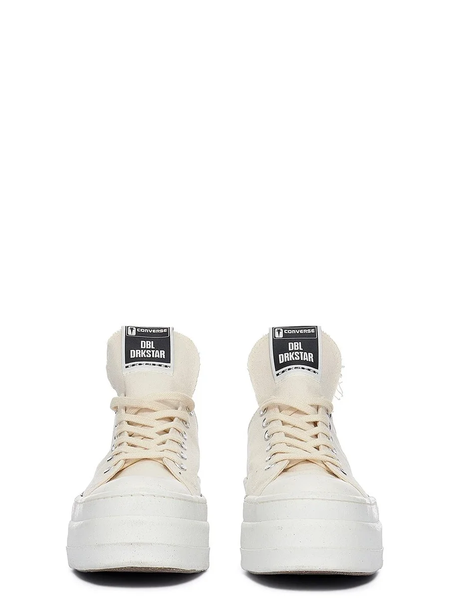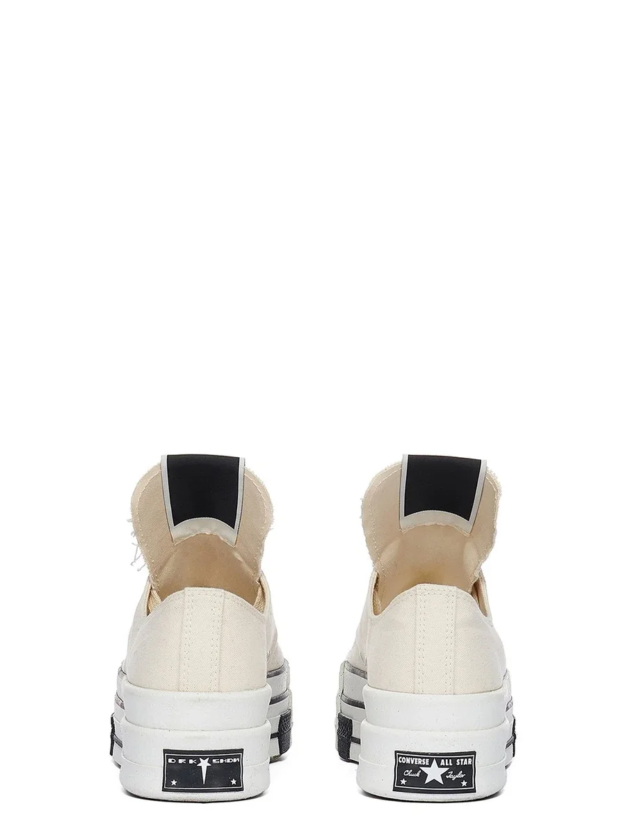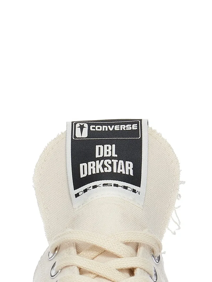 DEZE LAGE SCHOEN MET VETERSLUITING IS GEBASEERD OP DE KLASSIEKE CONVERSE CHUCKS UIT DE JAREN 70. HIJ HEEFT EEN KENMERKENDE, VERLENGDE DRKSHDW-TONG MET EEN GEWIKKELD, OMSLAGLABEL MET DE MODELNAAM. HET HEEFT EEN DUBBELE LAAG KLASSIEKE 70’S CHUCKS CONVERSE ZOOL, GESPANNEN DOOR EEN KENMERKENDE RICK OWENS SNEAKS, GEVORMDE, RUBBEREN HIEL EN TEENKAP MET EEN ONDERSCHEIDENDE GESPEKELDE ESTHETIEK.